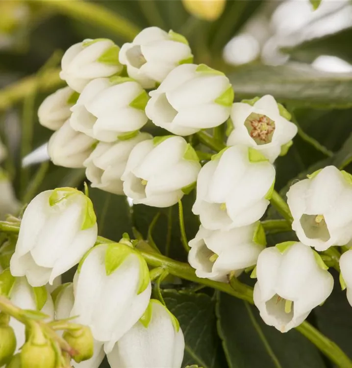 Glockenartige weiße Blüten, rosarote Winterknospen.