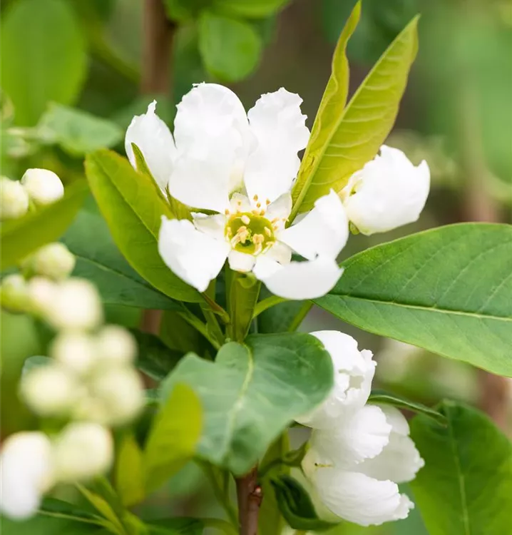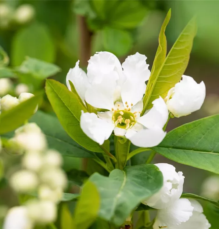 Blüte: Weiß, in Trauben; Apr.- Mai. Hellroter Jungaustrieb.