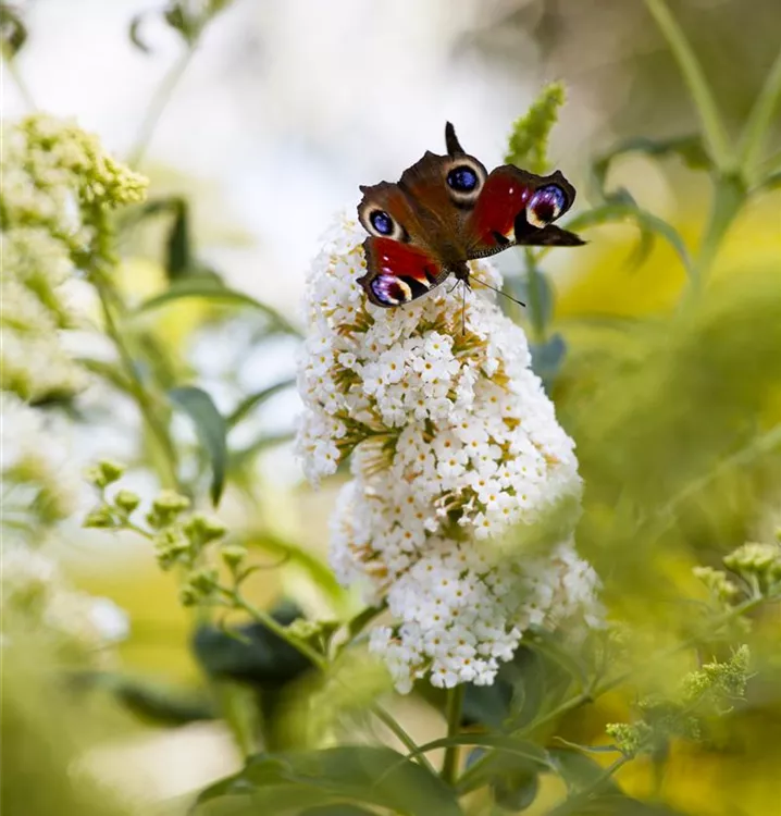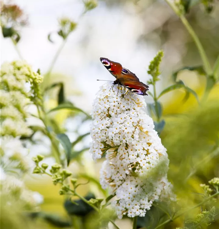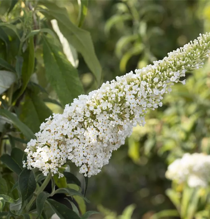 Blüte: Reinweiß, rispenförmig, leichter Duft; Juli-Oktober.