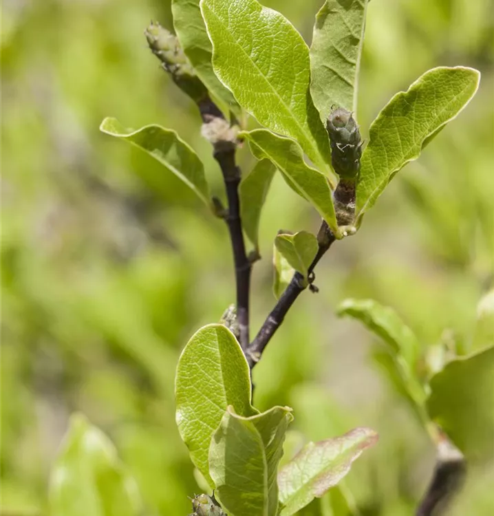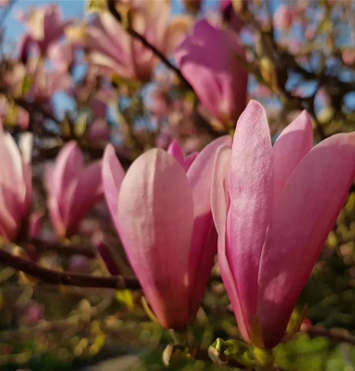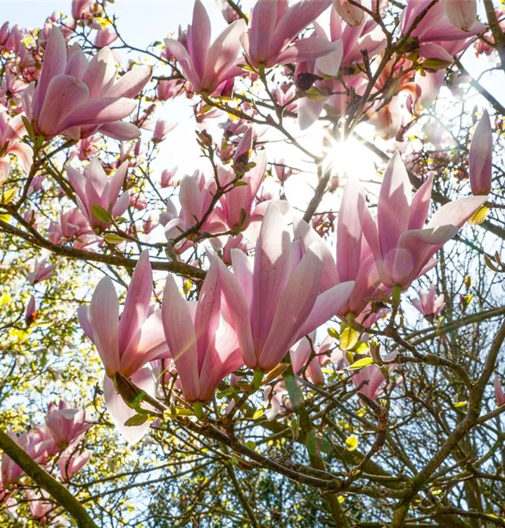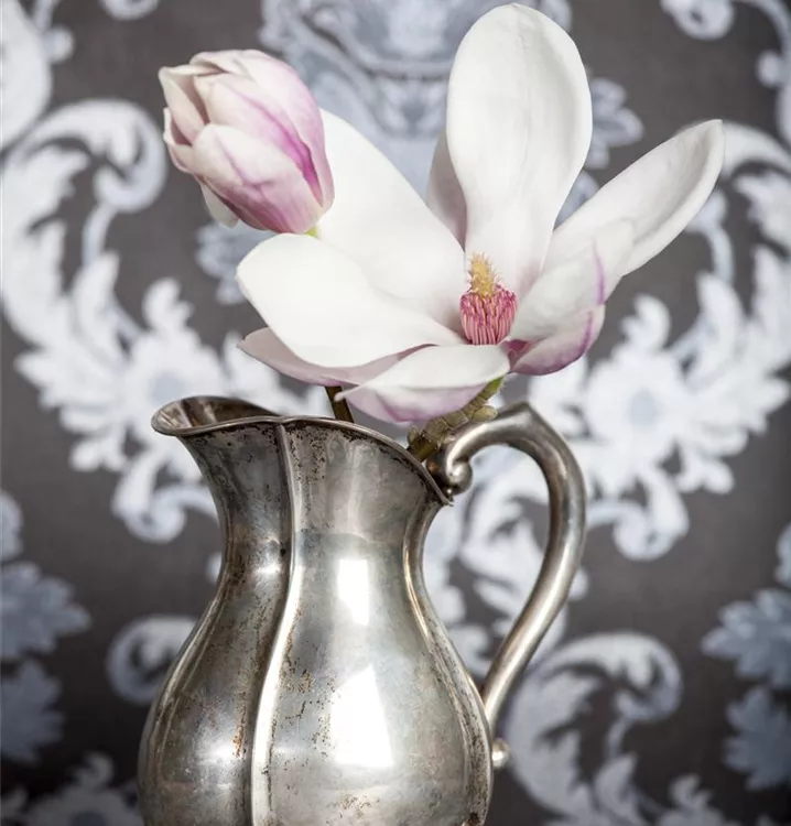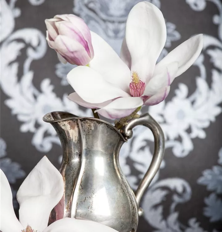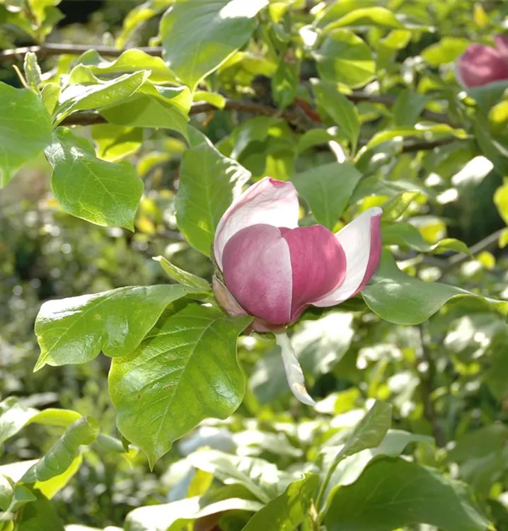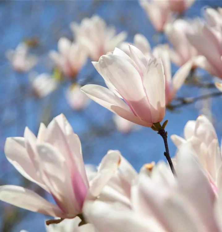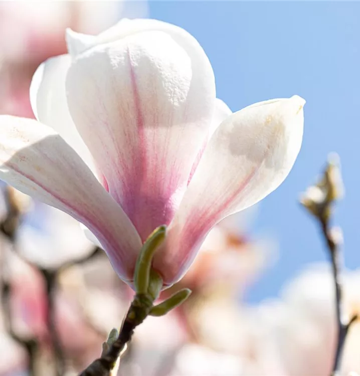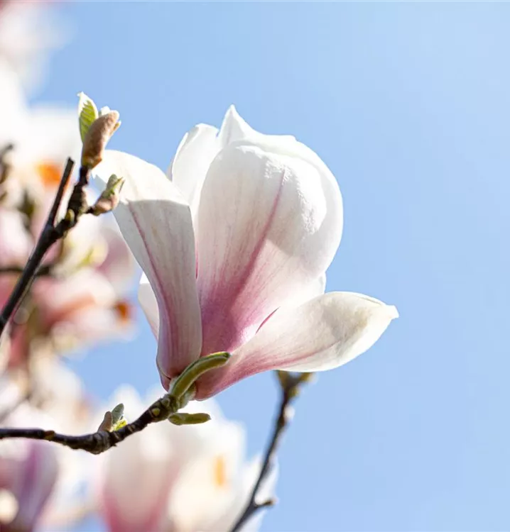 Blüte: Weiß mit einem Stich rosa, groß,zarter Duft; Anfang April - Mai. Wuchs: 3 - 5 m hoch + breit (25 - 50 cm p.a.)