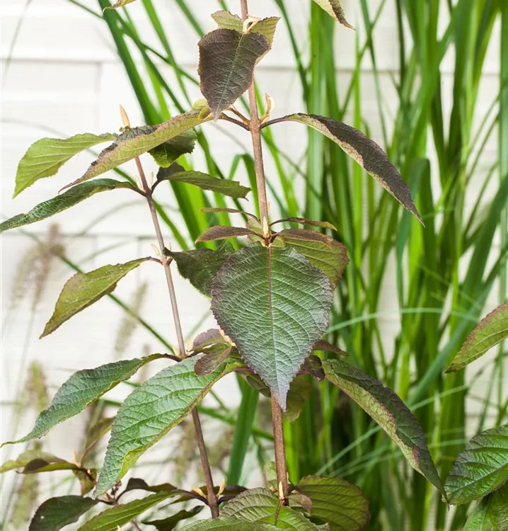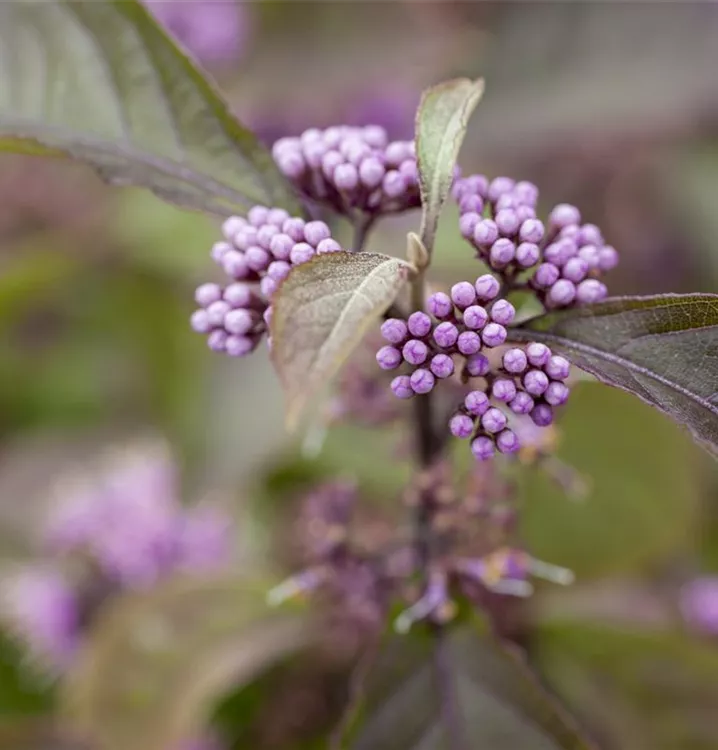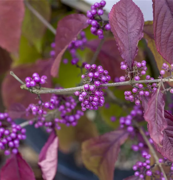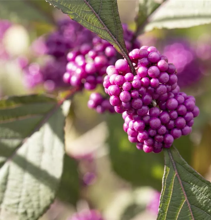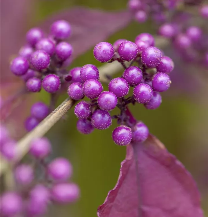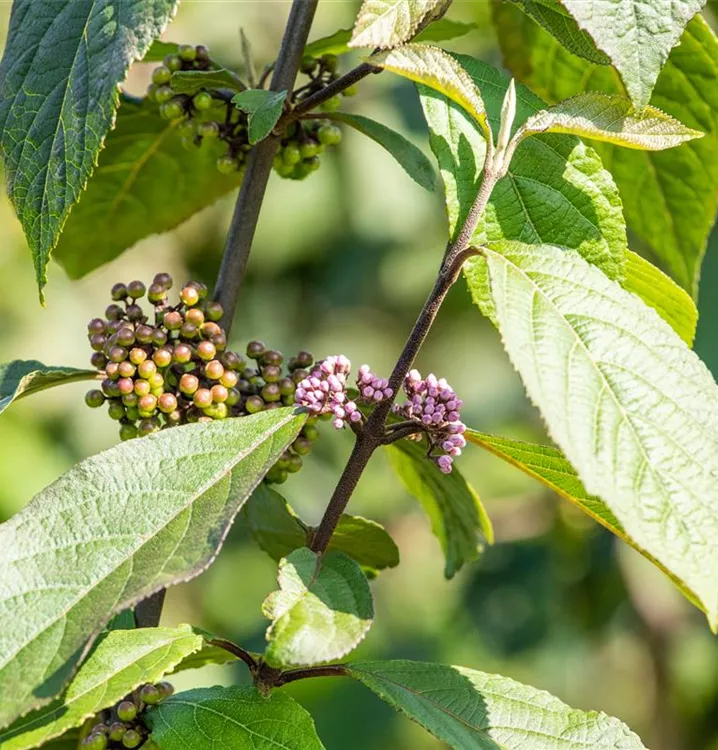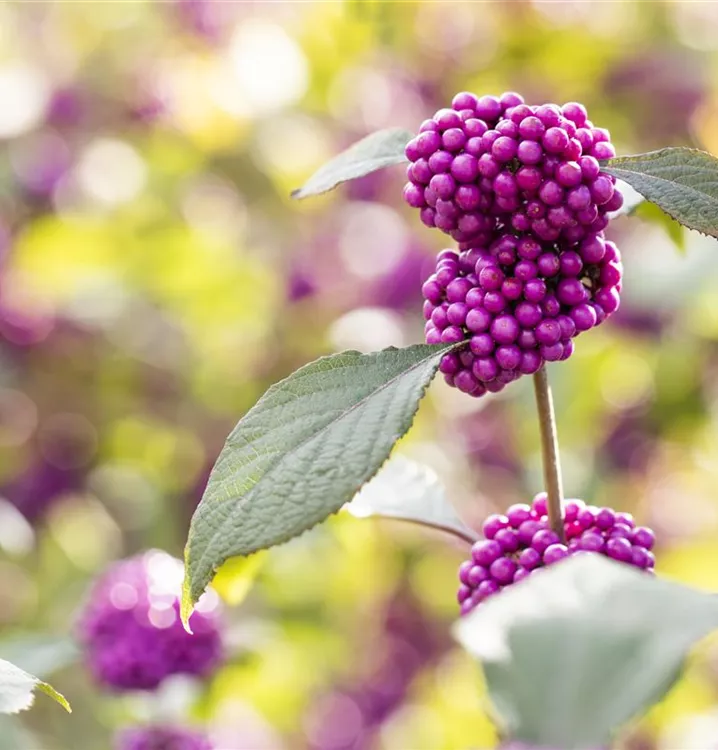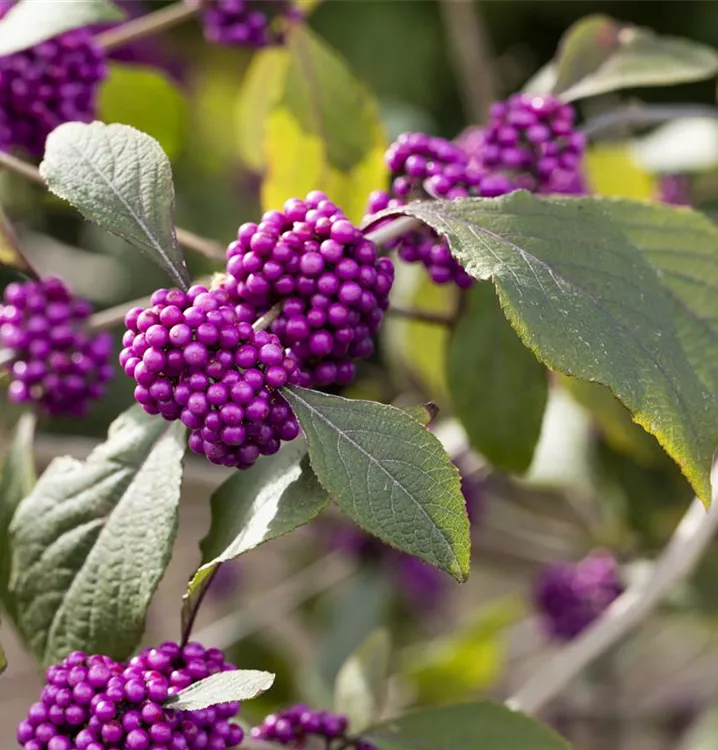 Blüte: Lila; Juli - August. Herbstfärbung! Rotviolette, zahl-reiche Früchte; Winter. Wuchs: Aufrecht; 2 - 3 m hoch.