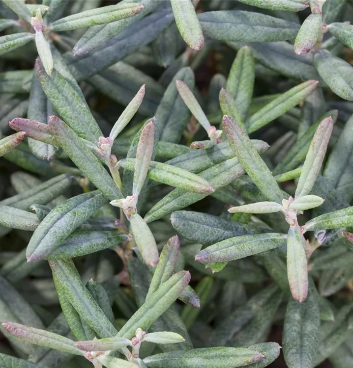 Blüte: Zartrosa, Mai - Juni. Immergrün; silbrigblau.