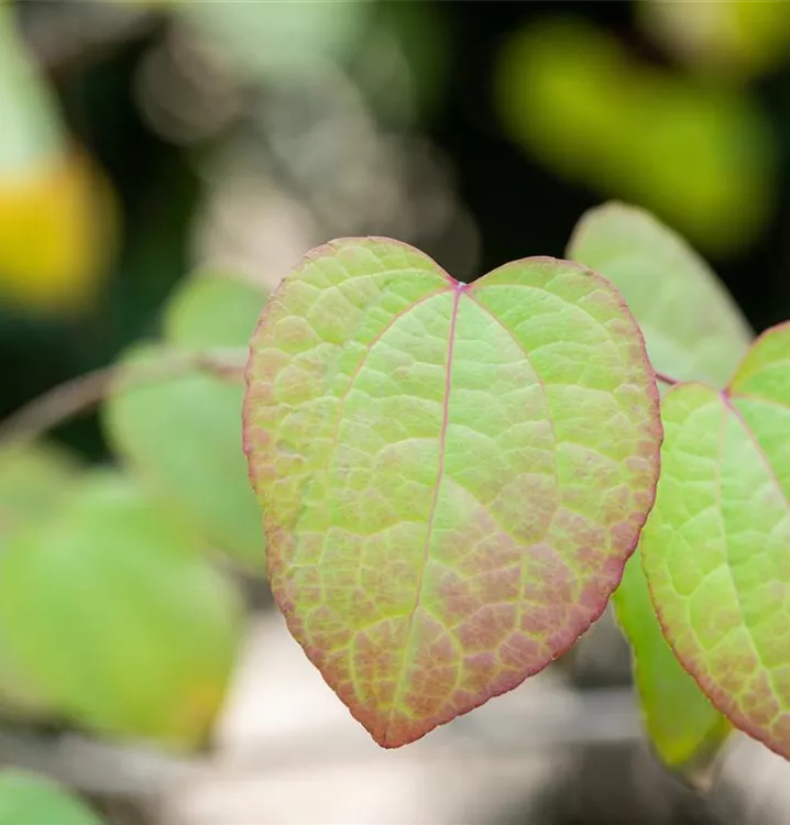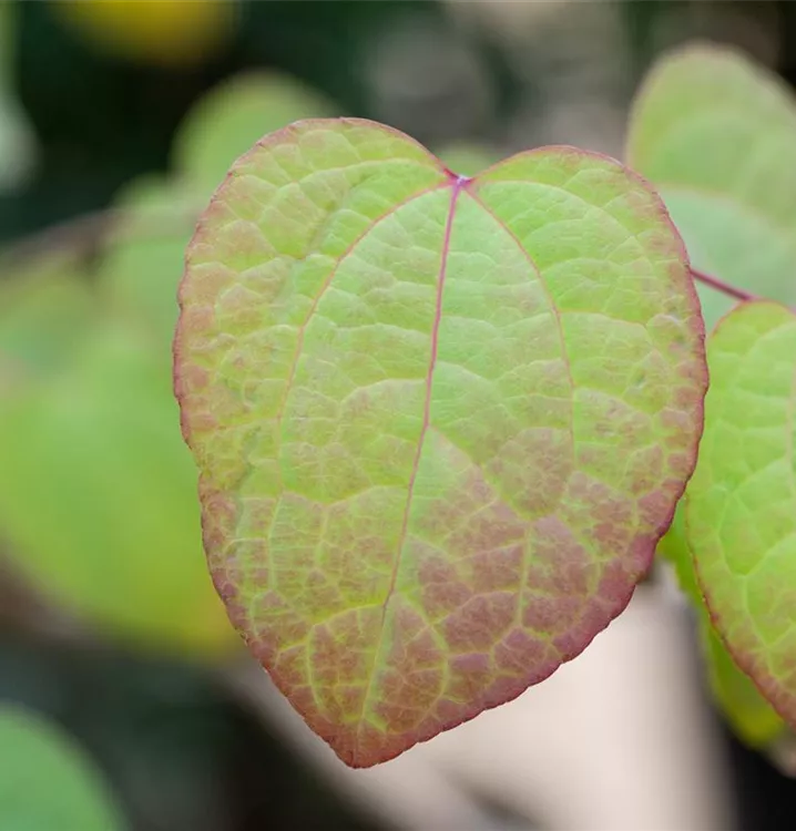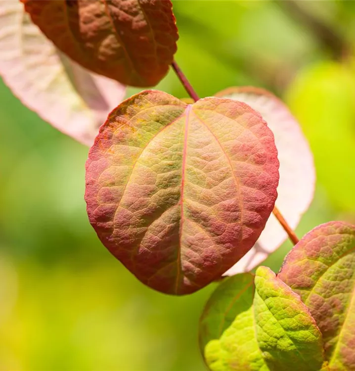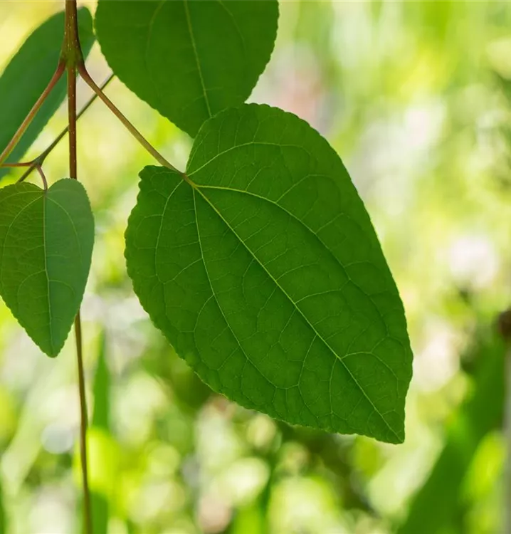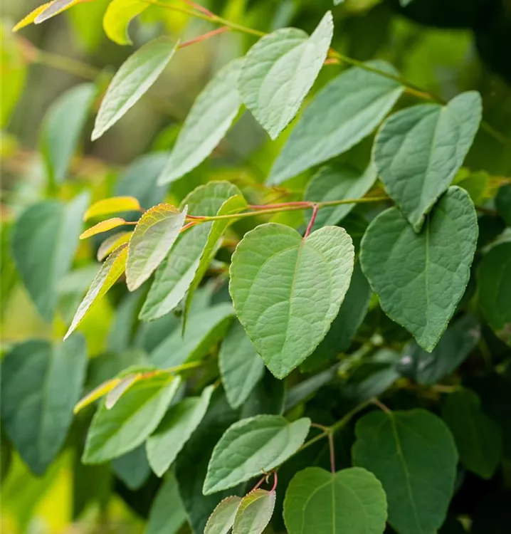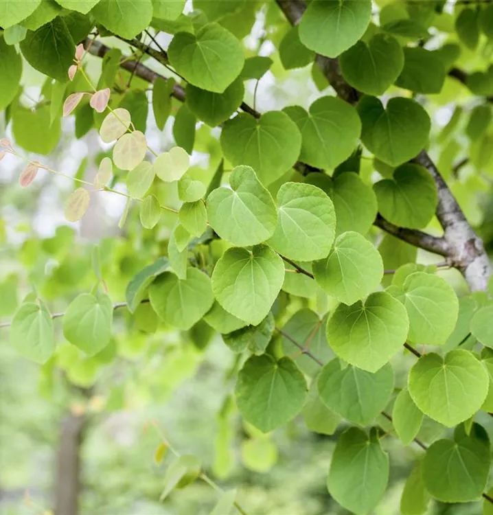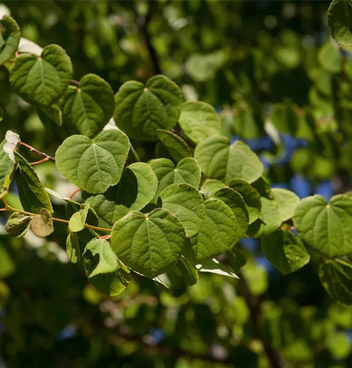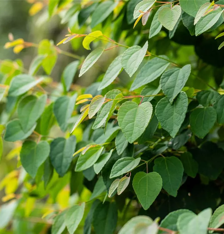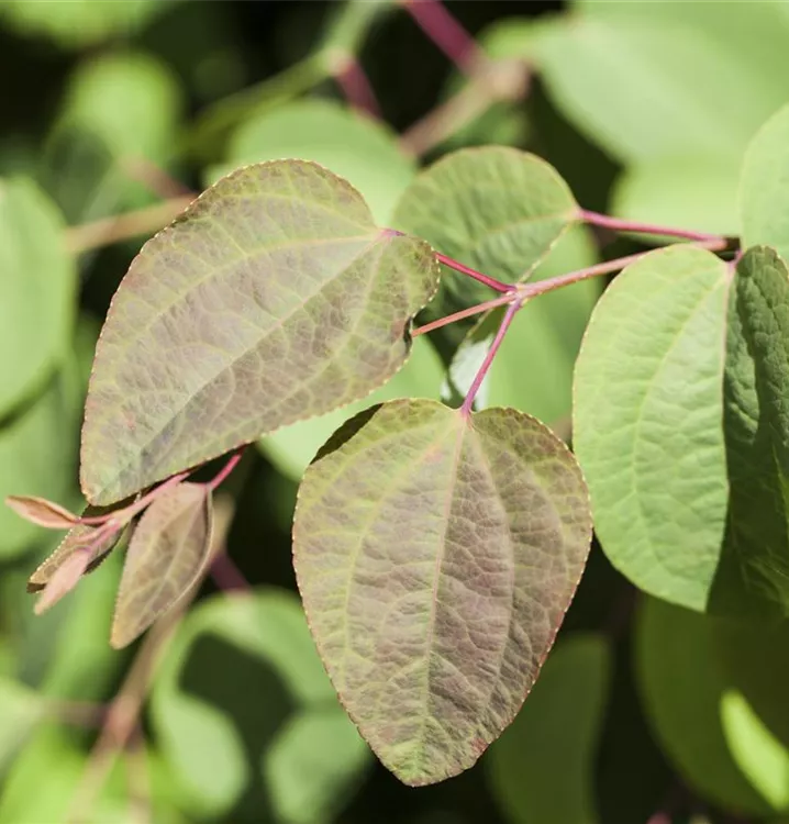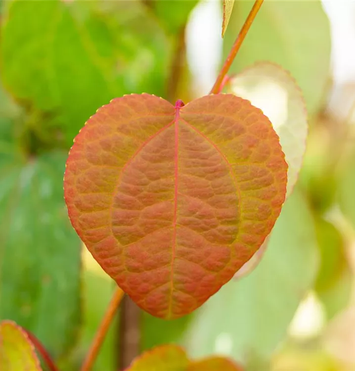 Blüte: Karminrot; April. Laub: Herzförmig, im Herbst gelb bis scharlachrot, nach Zimt duftend. 8 - 10 m hoch.