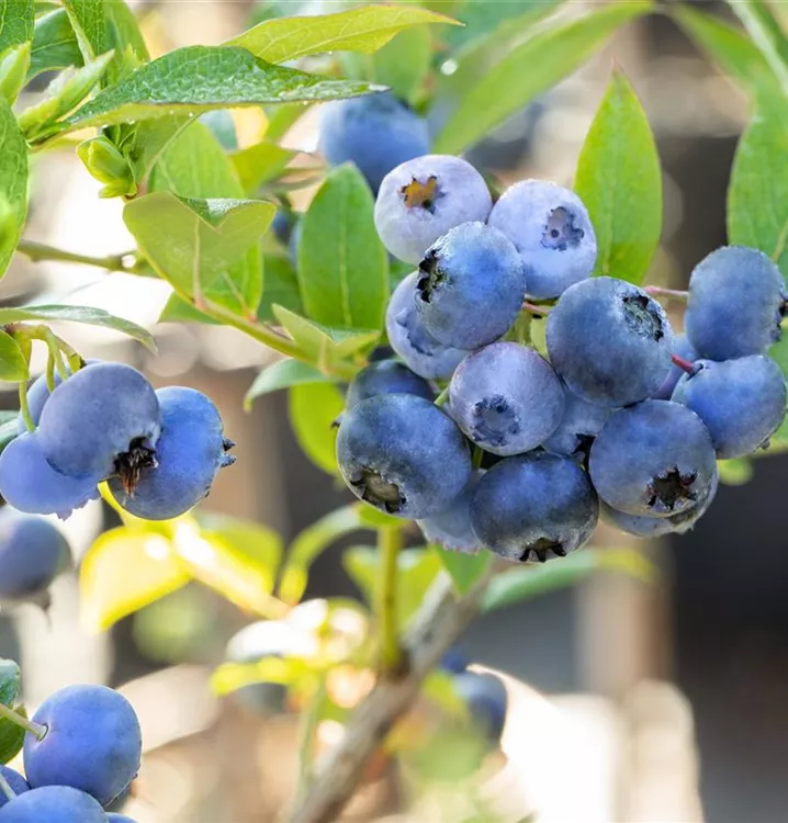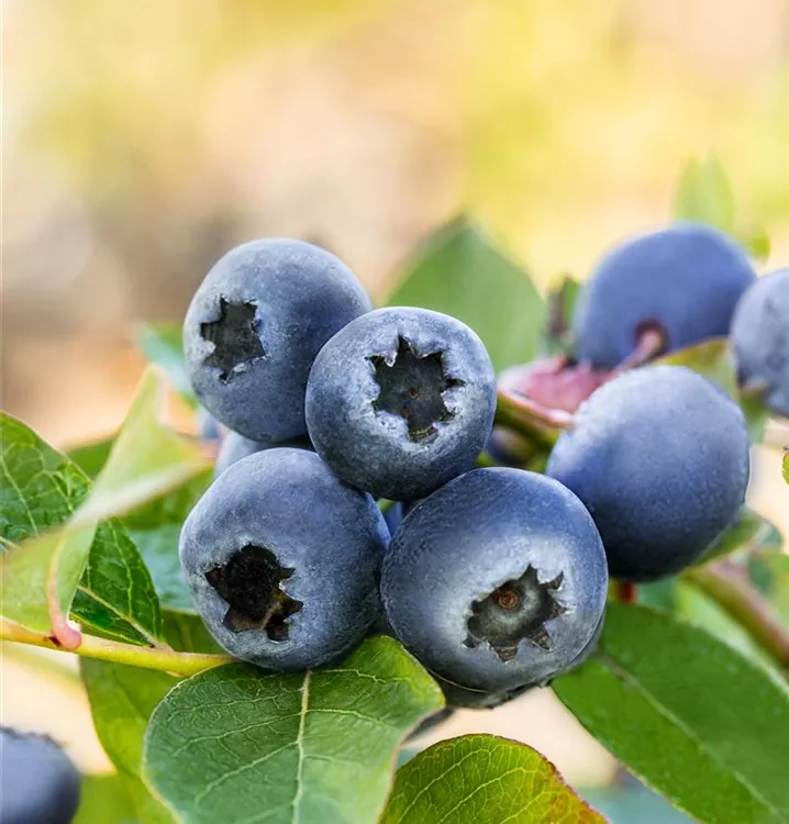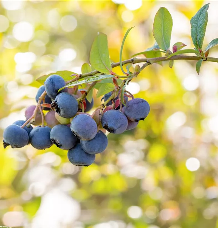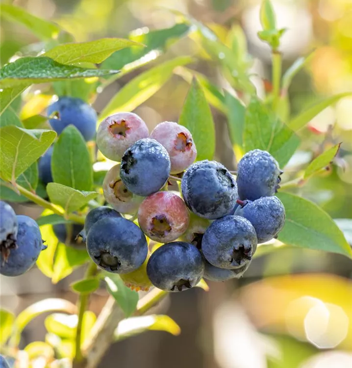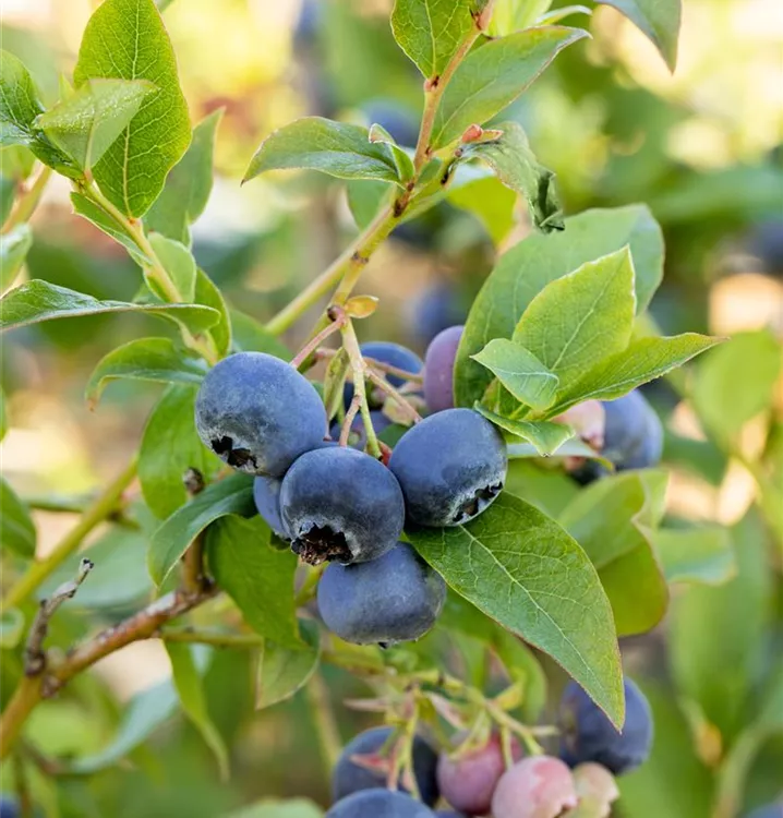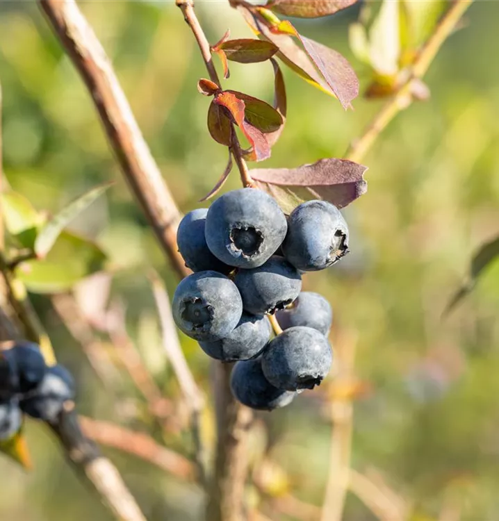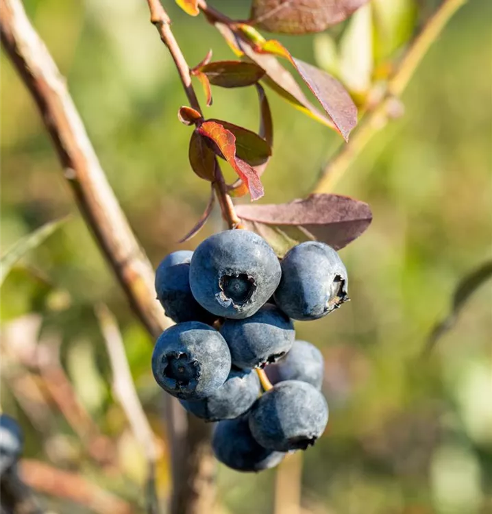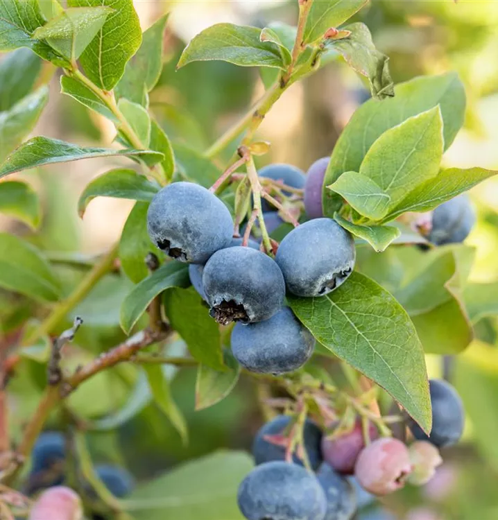 Frucht: Dunkelblau, groß, fest, süß, aromatisch; ab Ende Juli (ca. 4 Wochen). Wuchs:1- 1,2 m hoch (10-30 cm p.a.)