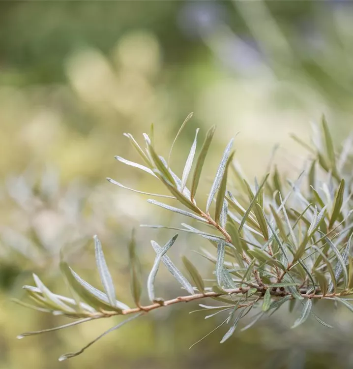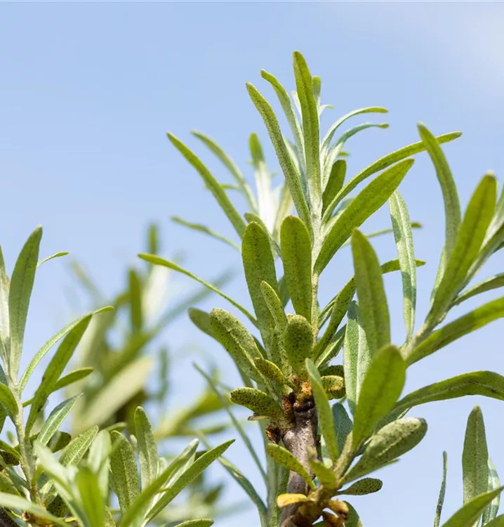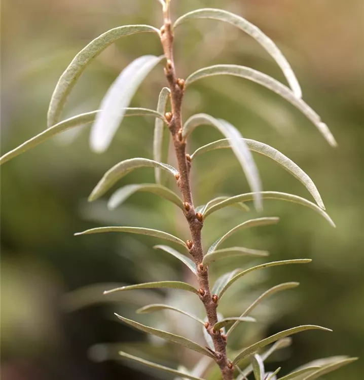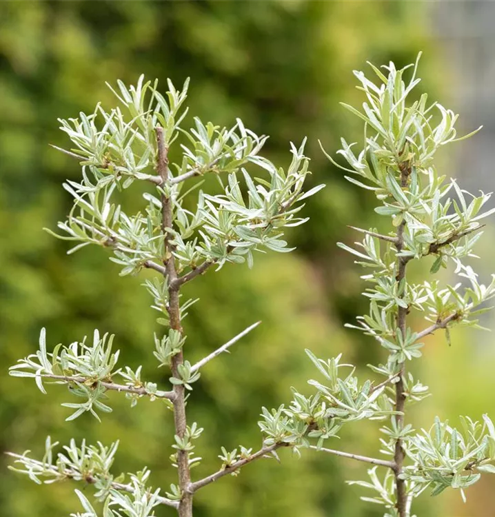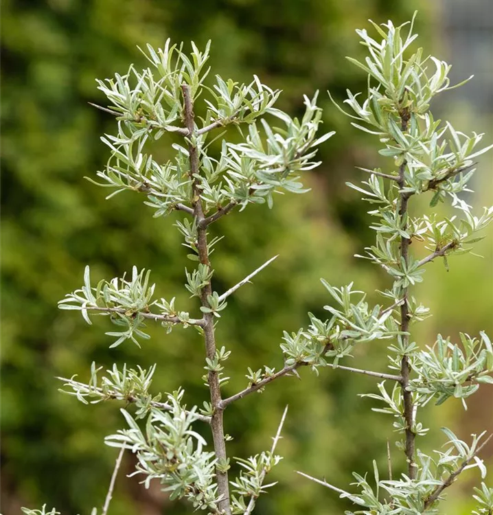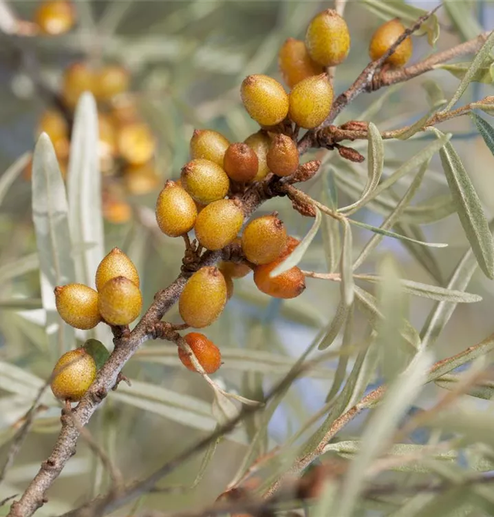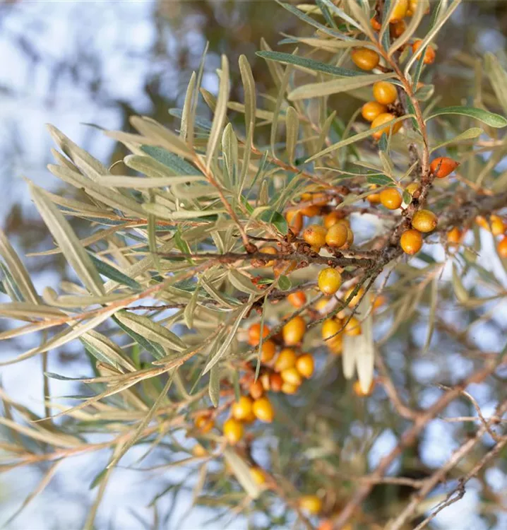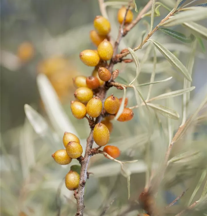 Blüte: Weibl. rund + klein, männl. lang + kegelförmig. Orangerote Beeren (Vitam C!!) 2 - 5 m hoch (25-45 cm j.)