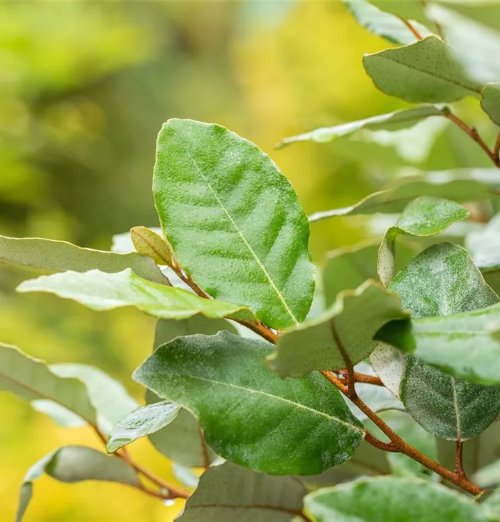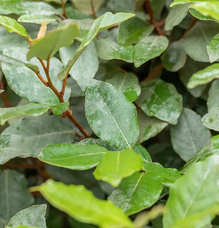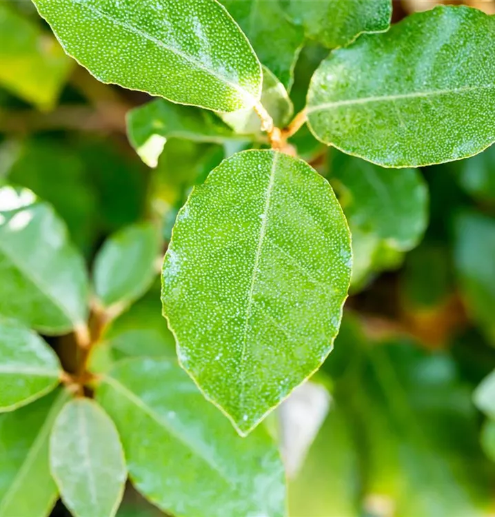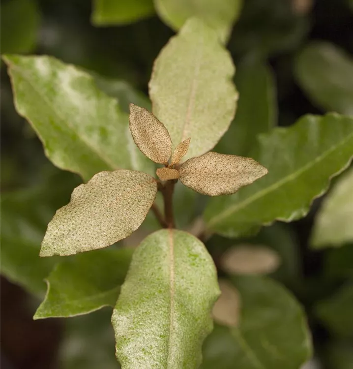 Laub: Silbrig, klein, wellig; immergrün. Im Sommer kleine, duftende cremefarbende Blüten. 4 - 6 m hoch.