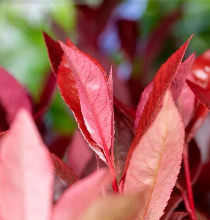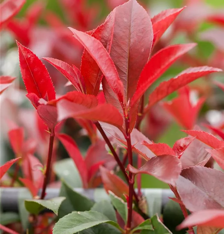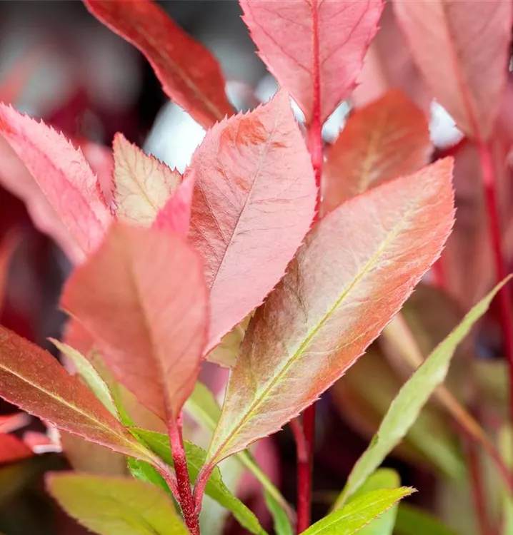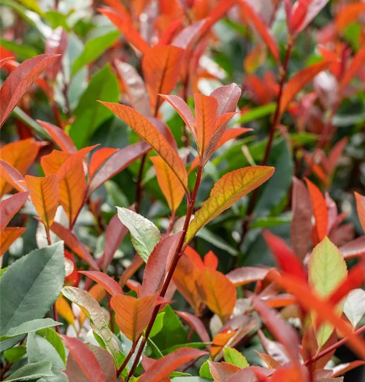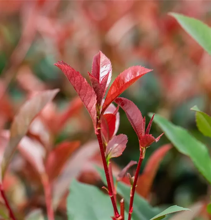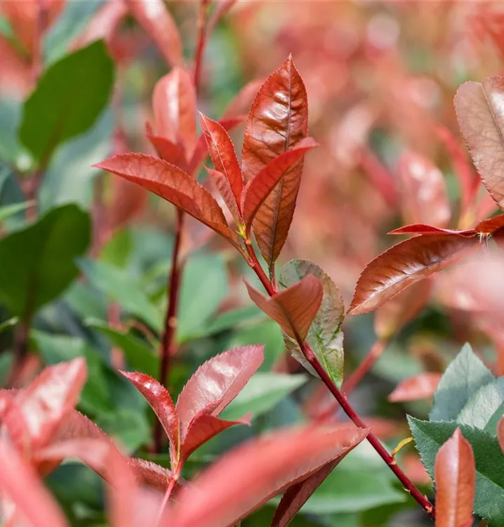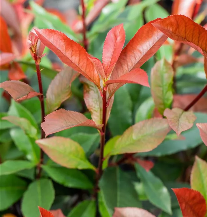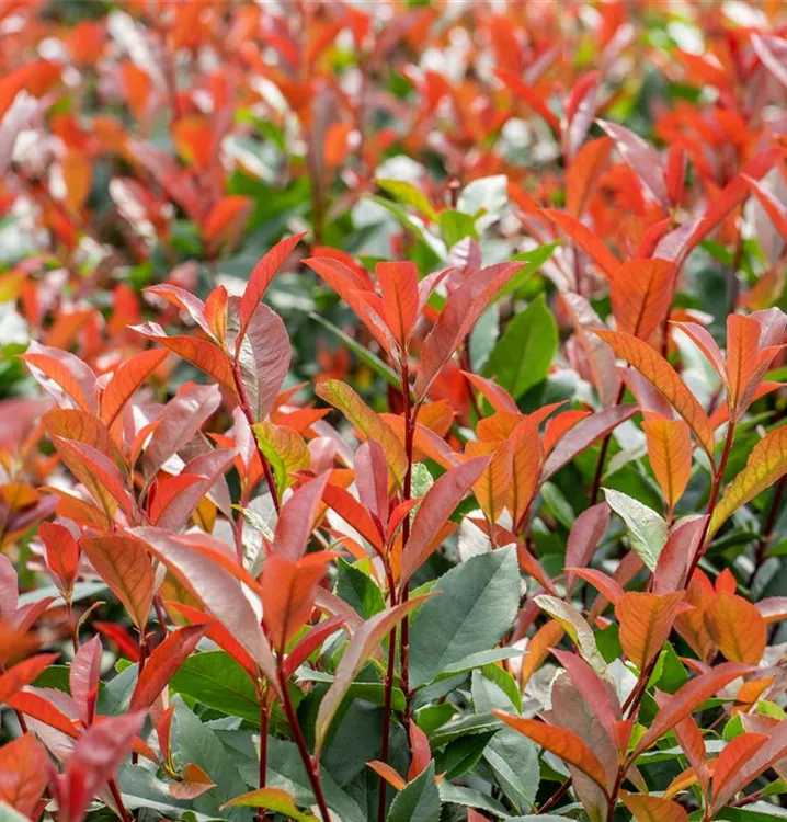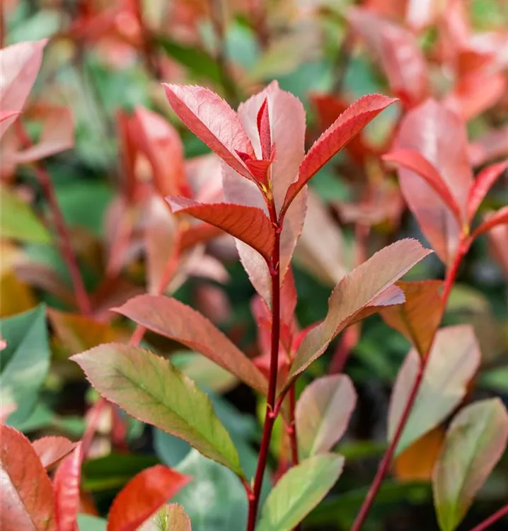 Blüte: Weiß; Mai - Juni. Blatt: Leuchtend roter Austrieb, immergrün. Wuchs: 2-2,5 m hoch (20 - 30 cm p.a.)