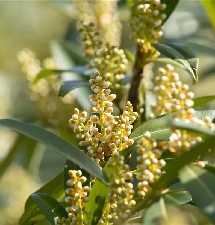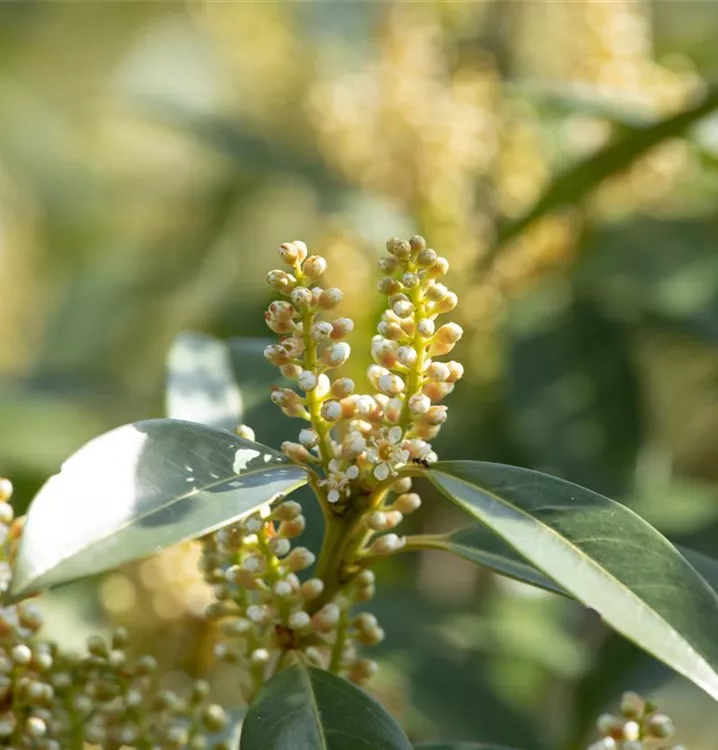 Blüte: Weiß, zarter Duft; Mai. Laub: Dunkelgrün; immer-