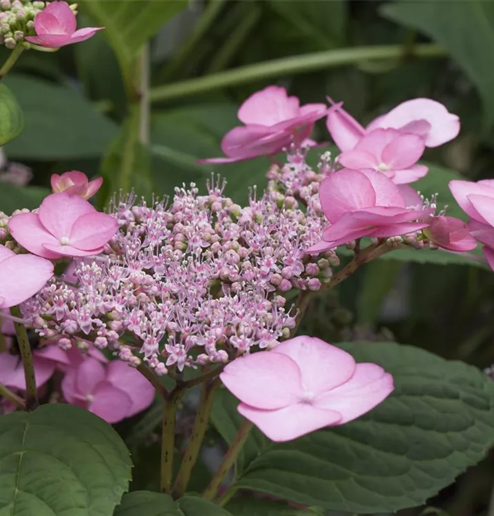 Blüte: Rosa bis eisblau (ph-abhängig); Juli - August.