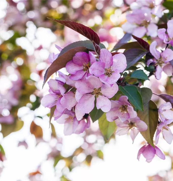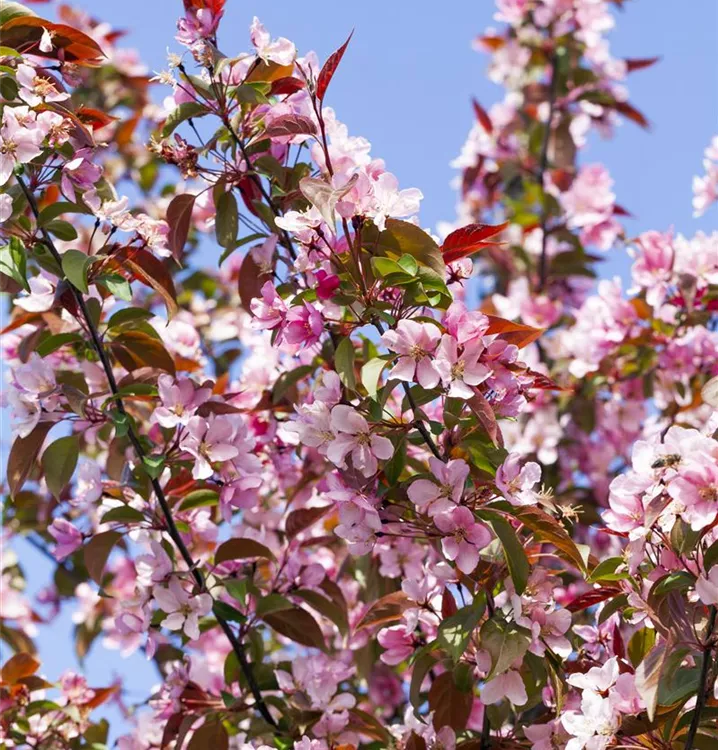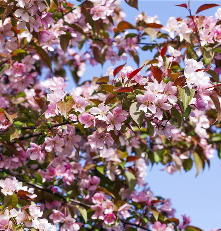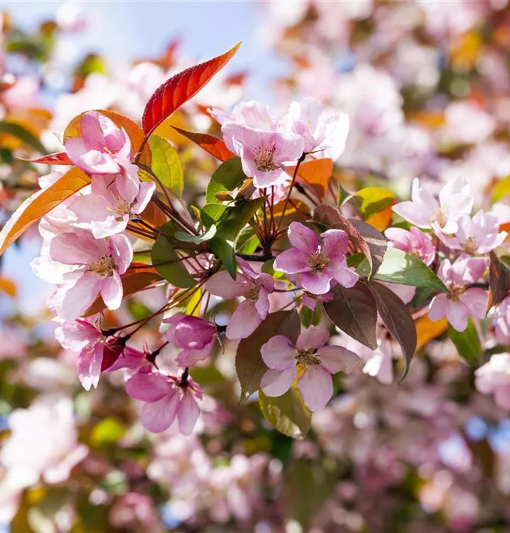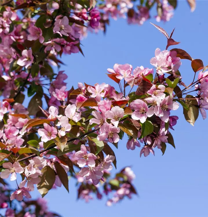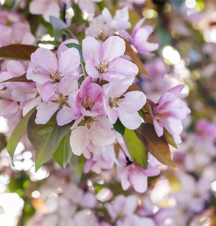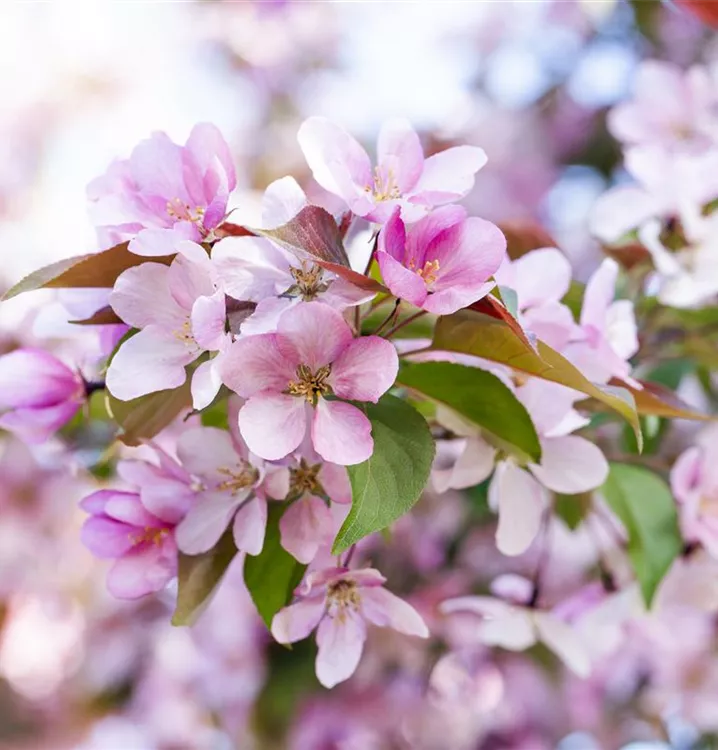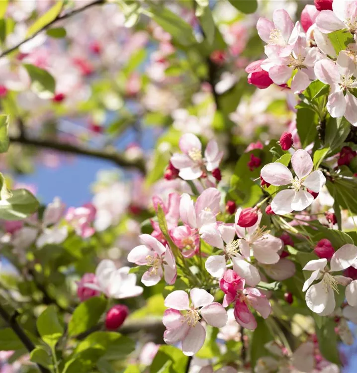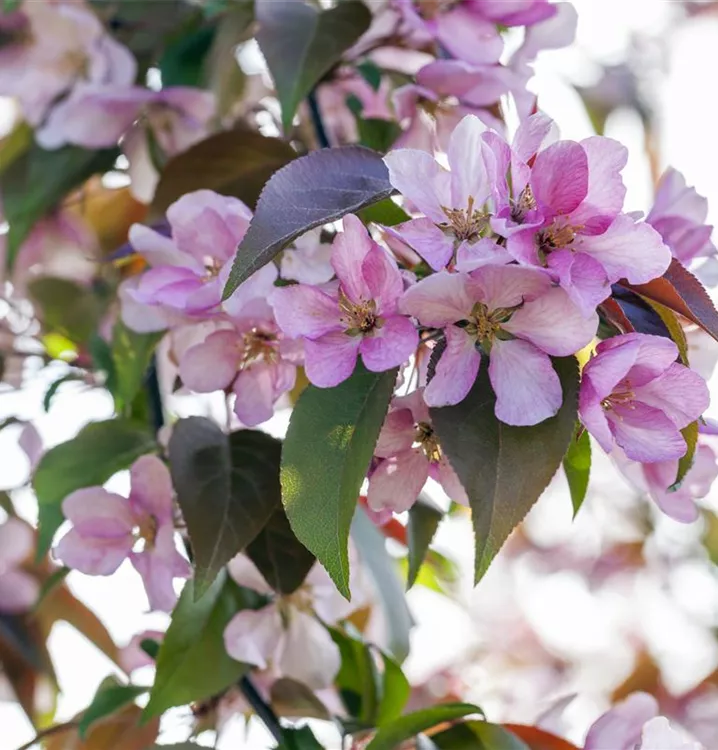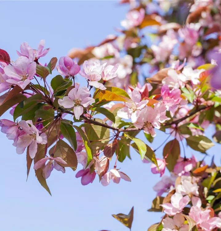 Blatt: grün; Blüte: zweifarbig hellrosa und weiß, einfach, mittel; Frucht: gelb mit rot. Überhängend.