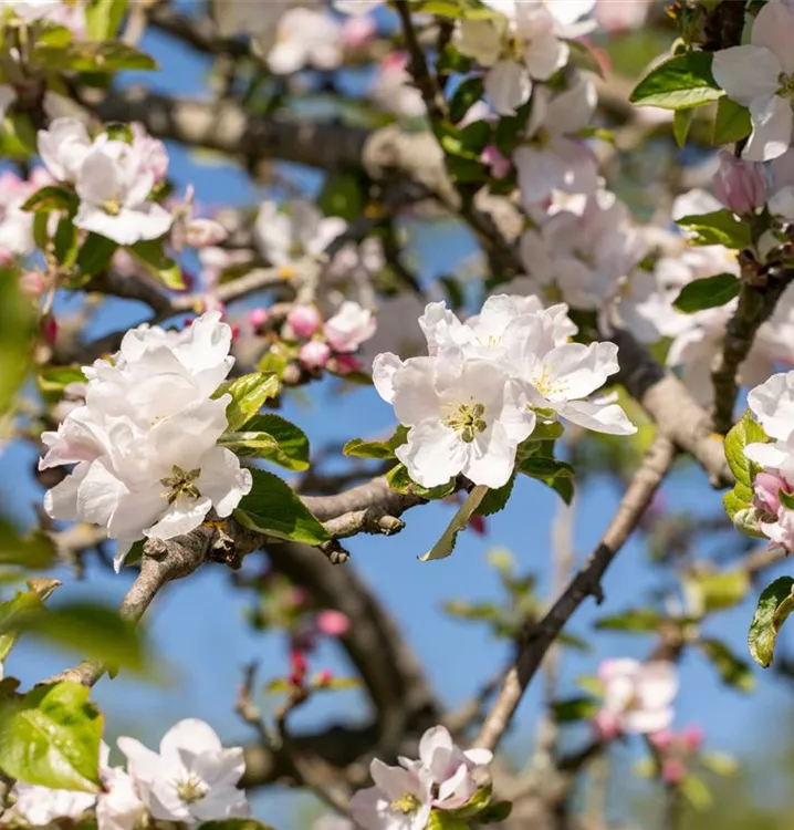 Blüte: Weiß, rosa angehaucht; April - Mai. Fruchtschmuck ab Sept. Wuchs: 3 - 6 m hoch (25 - 60 cm p.a.).