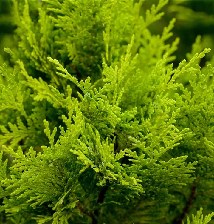 Nadeln: Gelb, schuppenförmig, immergrün. Wuchs: Stark, breit kegelförmig; 4,5 - 7 m hoch (10-20 cm p.a.)