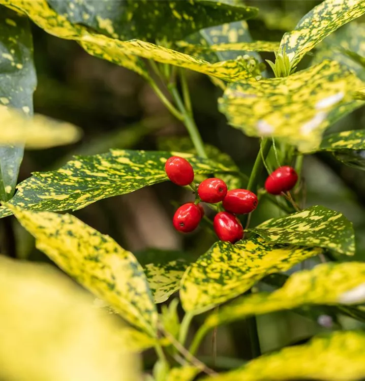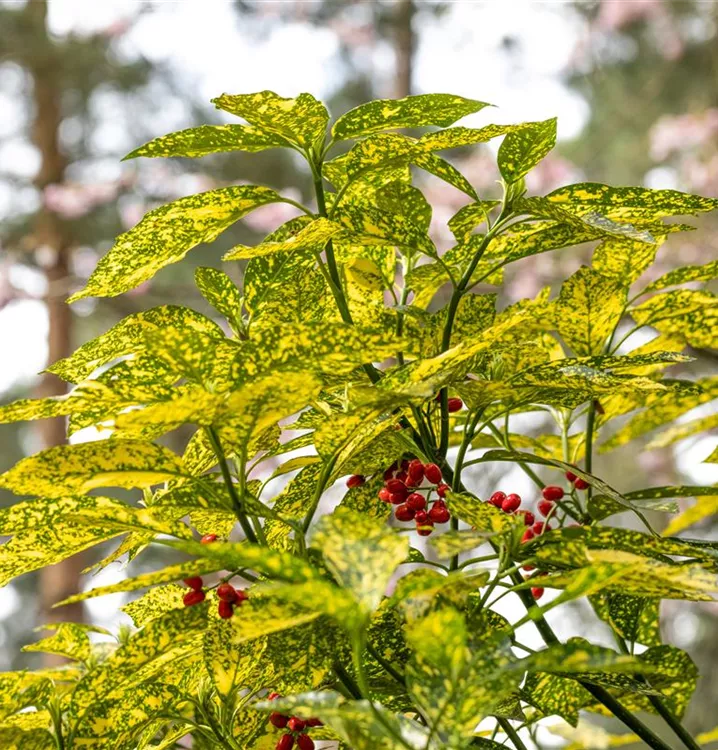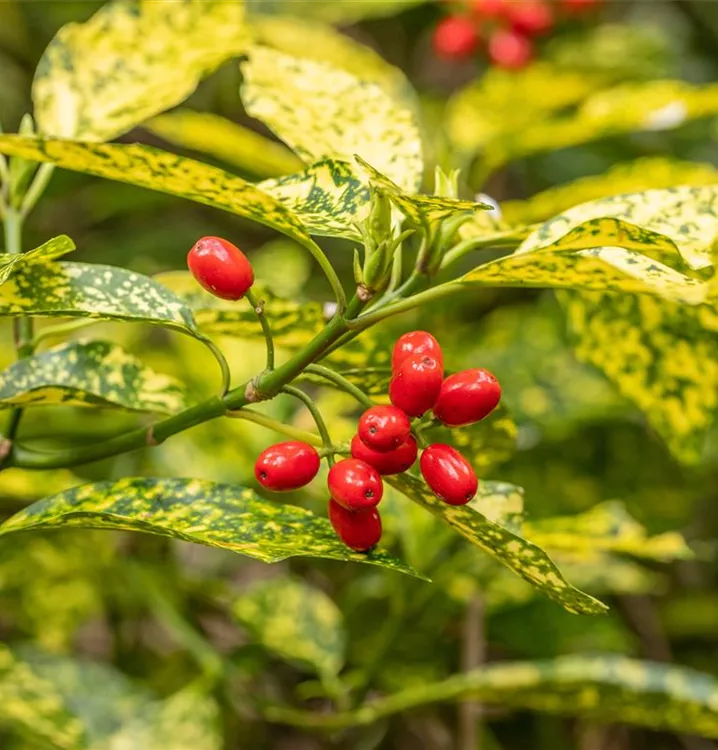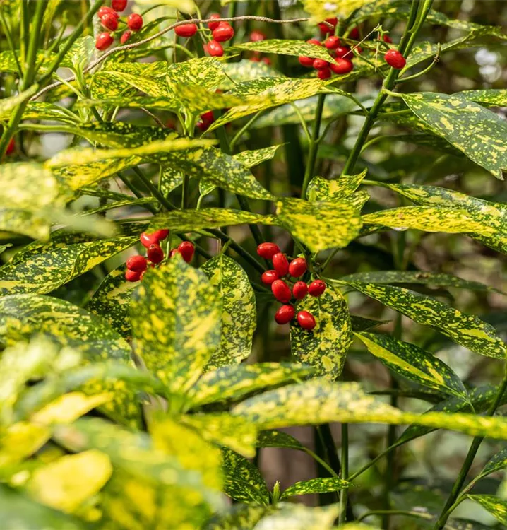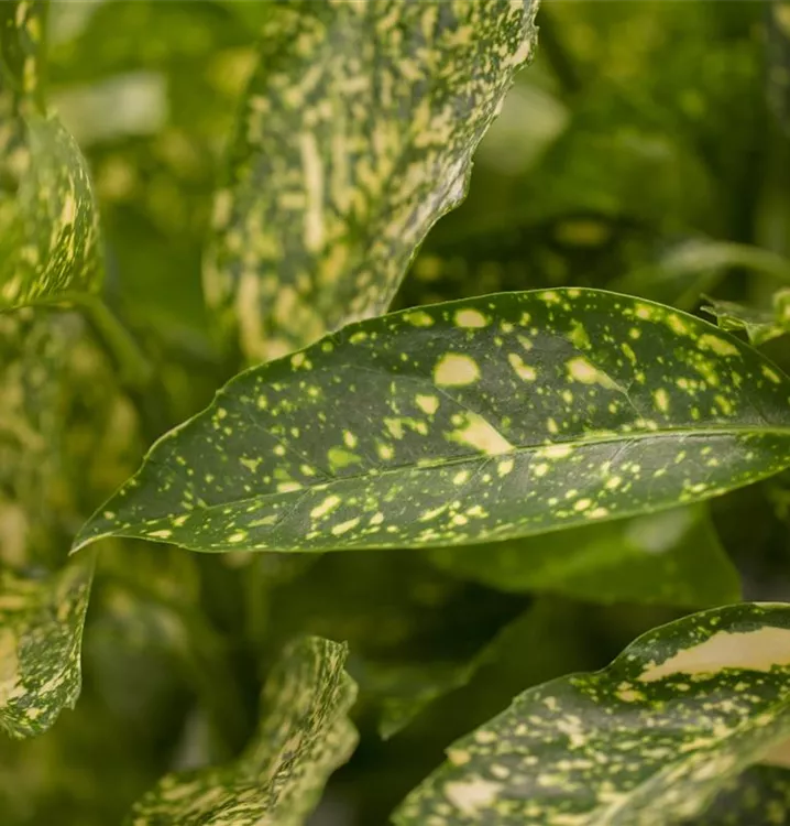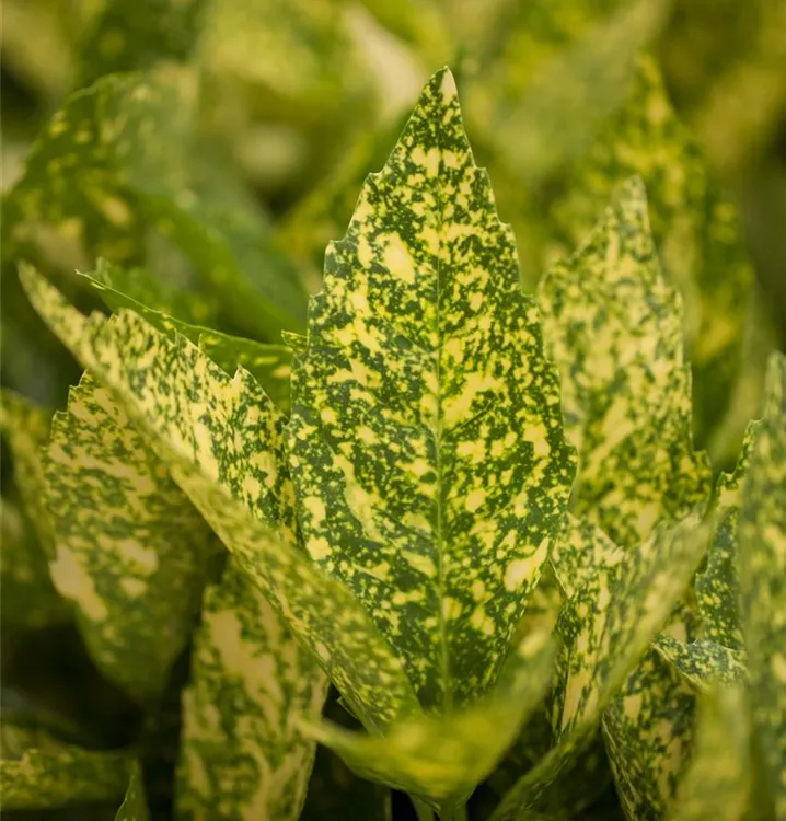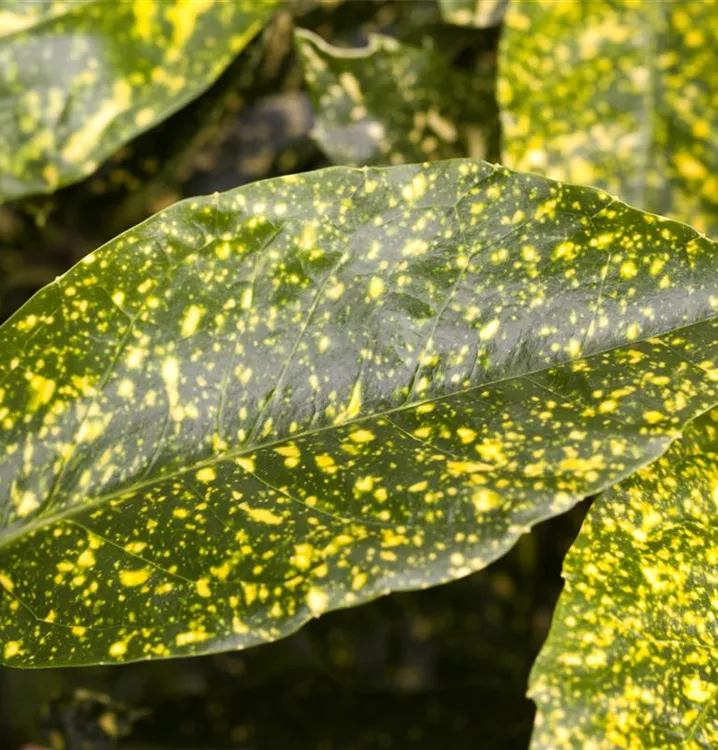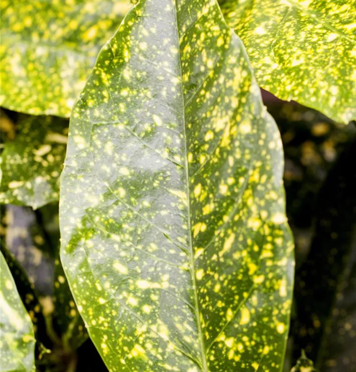 Blüte: Rötlich; April - Mai. Blatt: Groß, grün + gelbgrün punktiert; immergrün. 150 - 300 cm hoch (5 - 15 cm/p.a.)