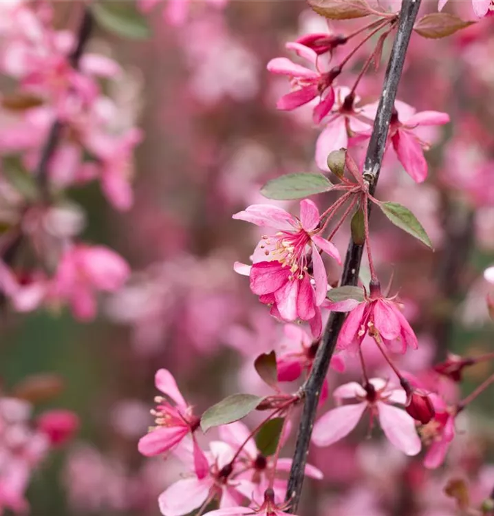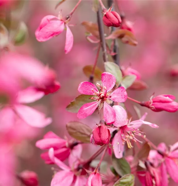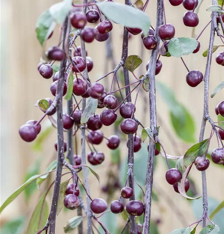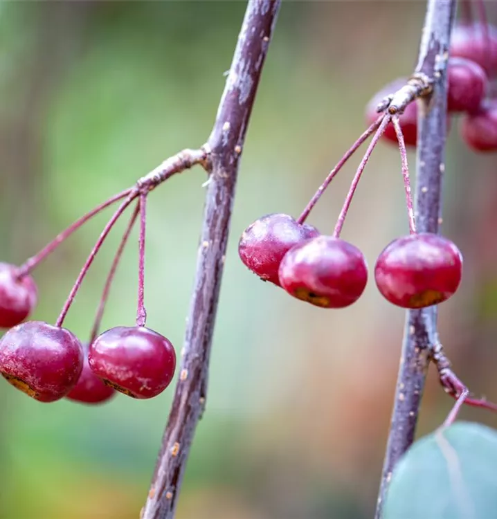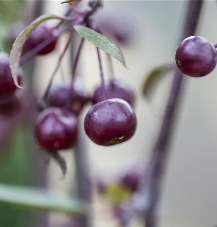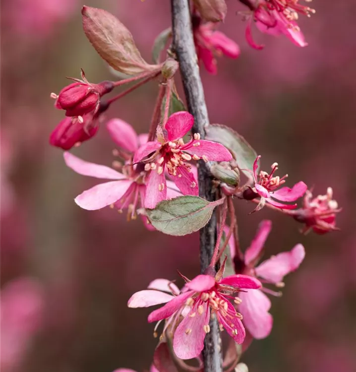 Blüte: Weinrot; Mai. Frucht: Tiefrot. Laub: Rot.