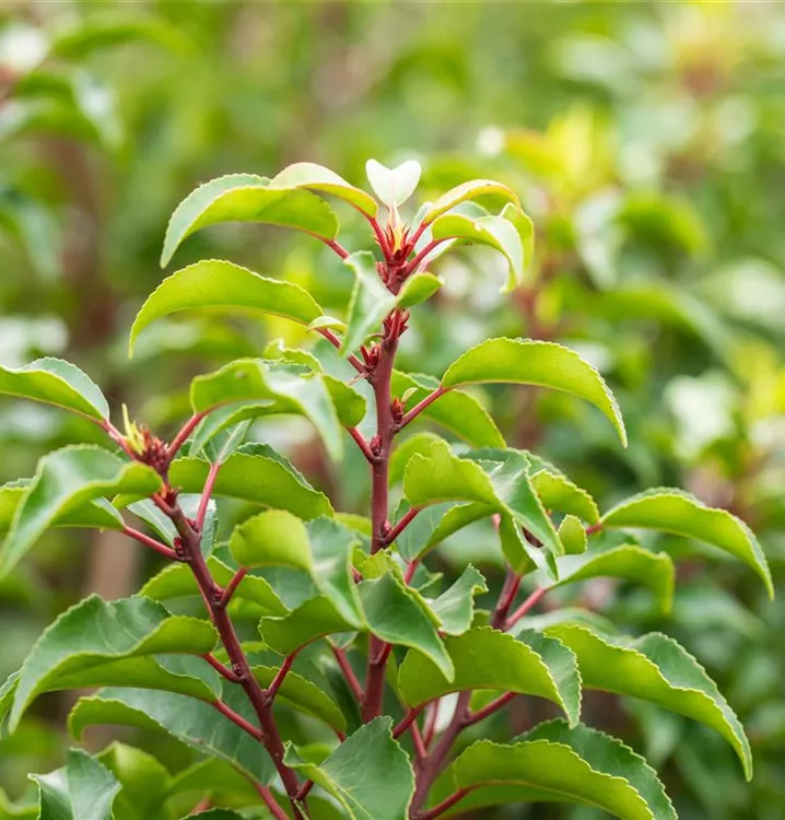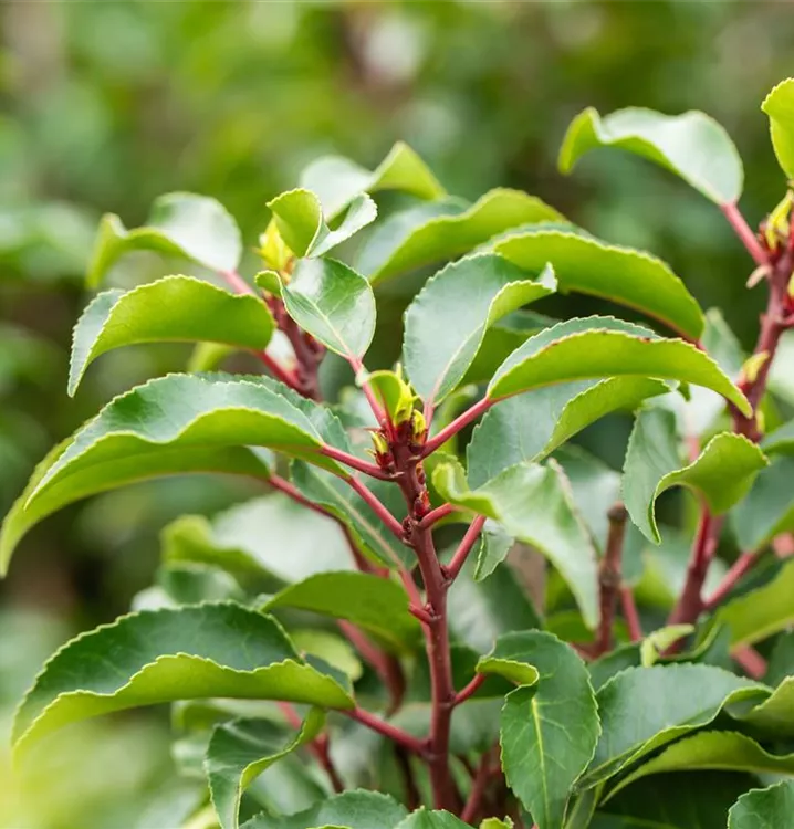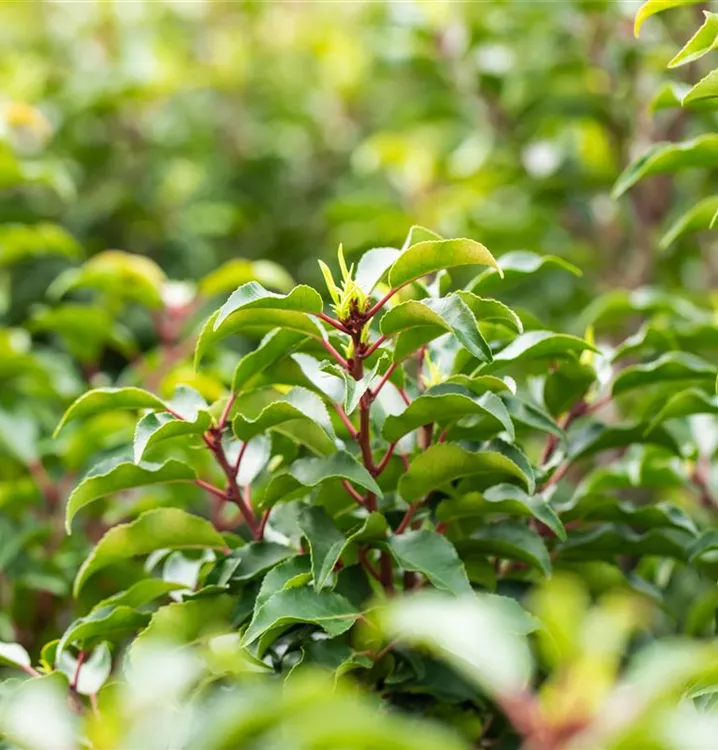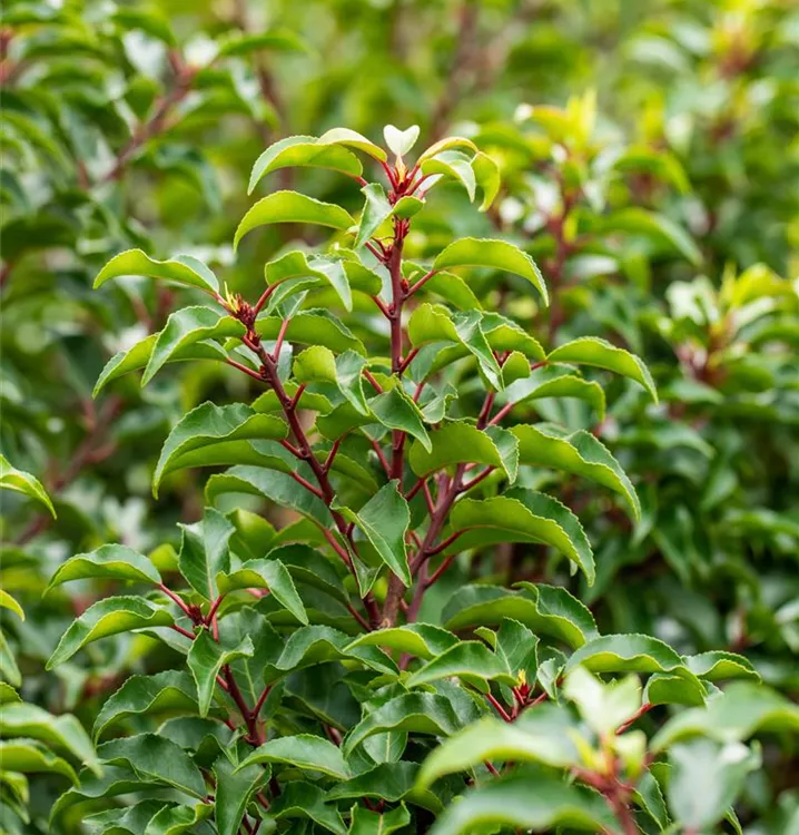Gut verzweigter Strauch, pyramidaler Wuchs, dunkelgrüne, glänzende Blätter, anspruchslos, winterhart