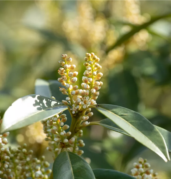 Blüte: Weiß, zarter Duft; Mai. Laub: Dunkelgrün; immer-