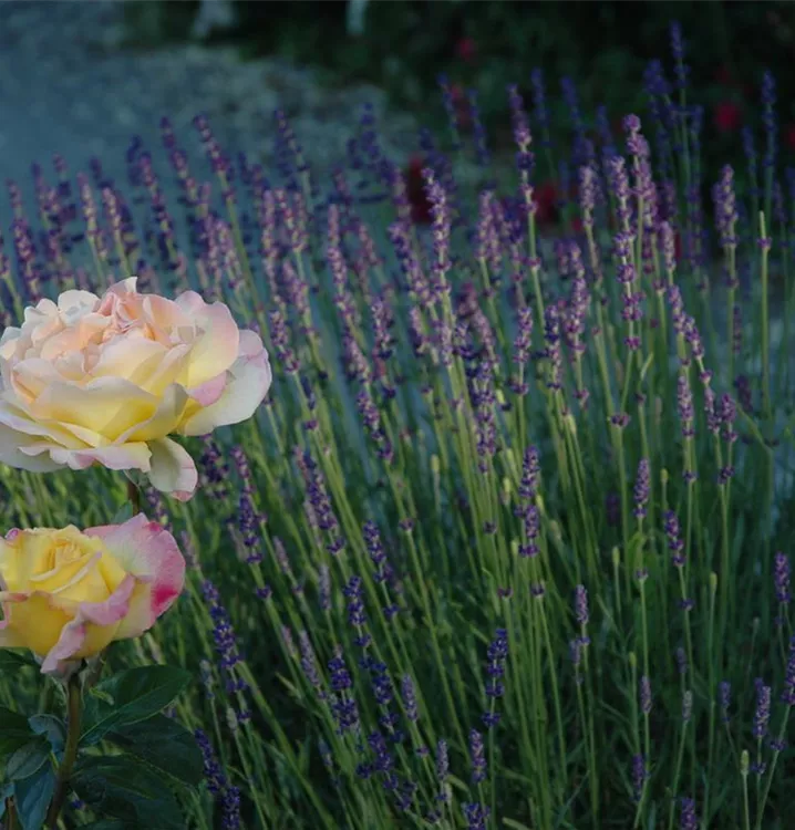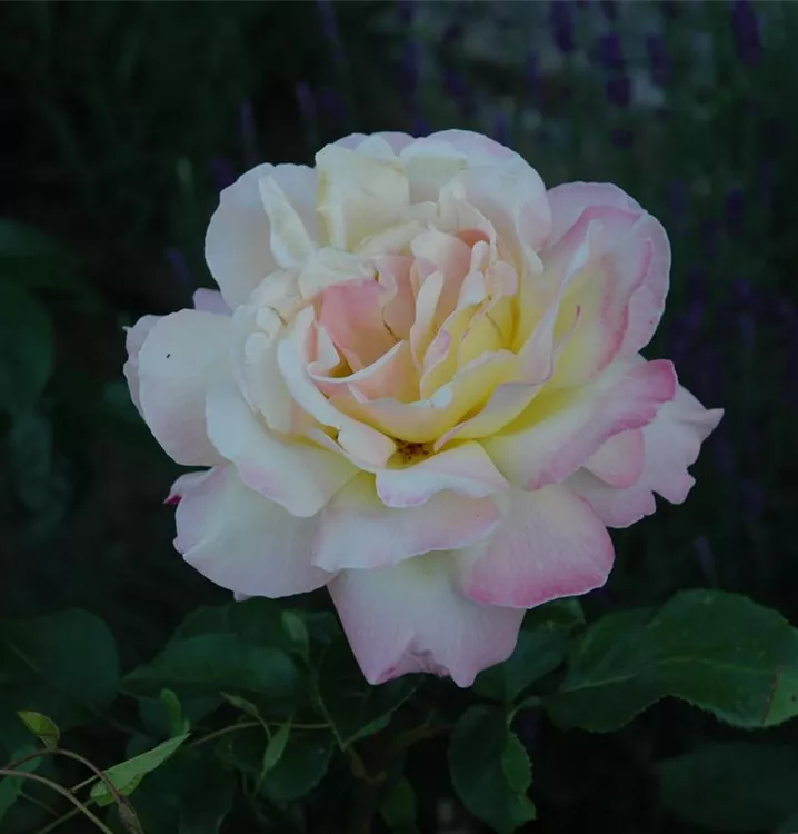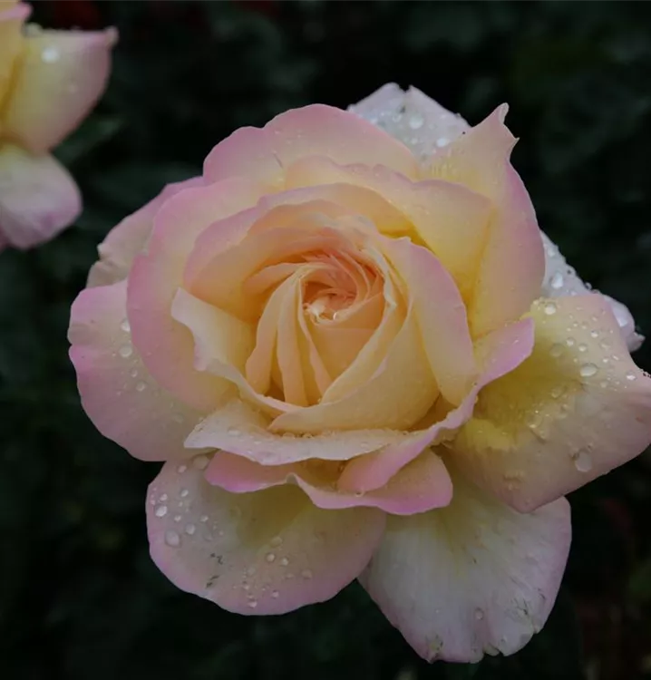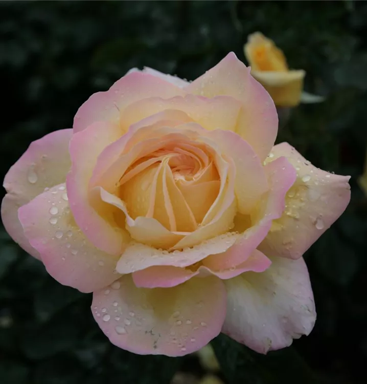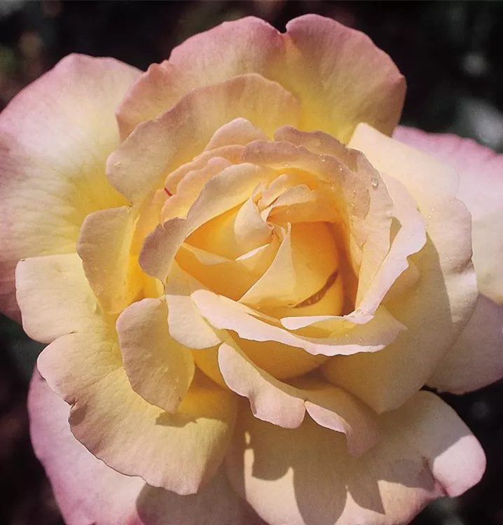 Blüte: Gelb, zum Rand rosa, gefüllt, groß, angenehmer Duft, öfter blühend. Wuchs: Aufrecht; 70 - 100 cm hoch.