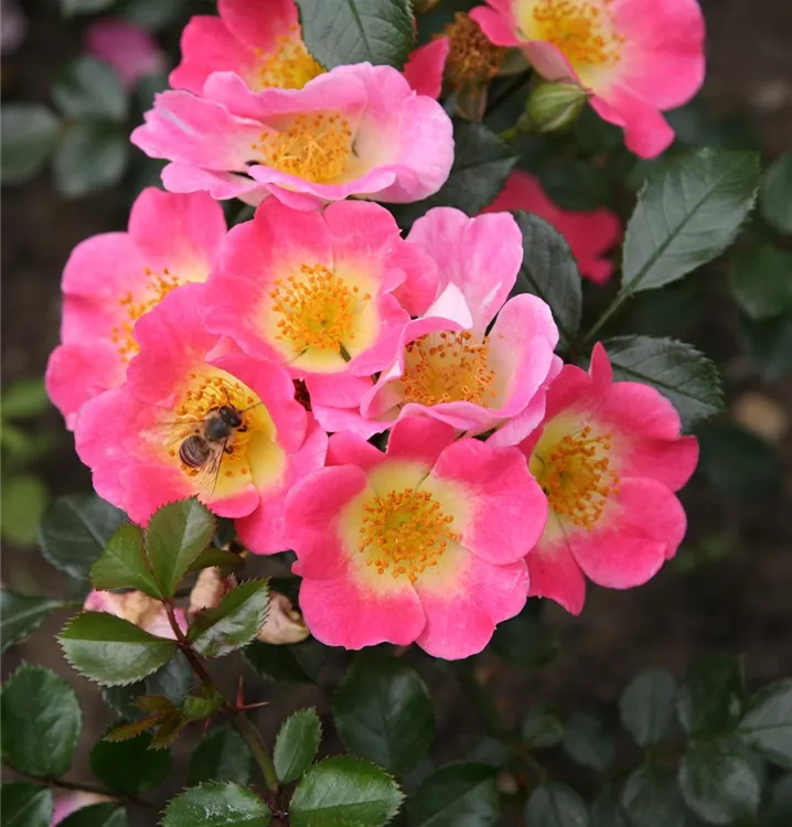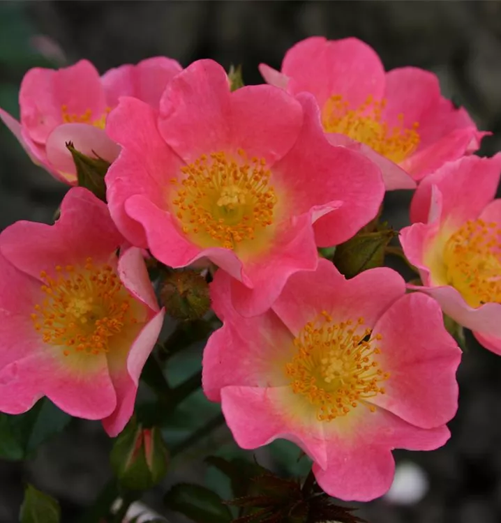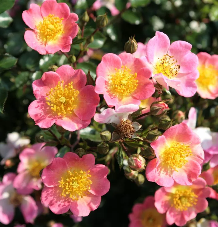 Blüte: Rosa, gelbe Mitte, einfach, zarter Duft;öfterblühend.