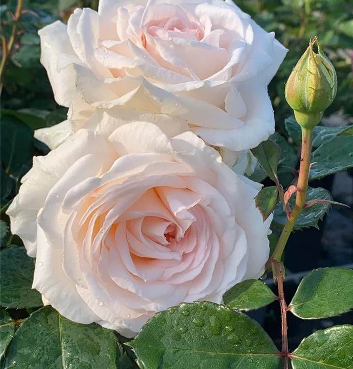 Blüte: Cremeweiß, rosa angehaucht, dufternd; öfter-