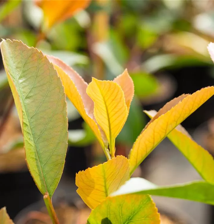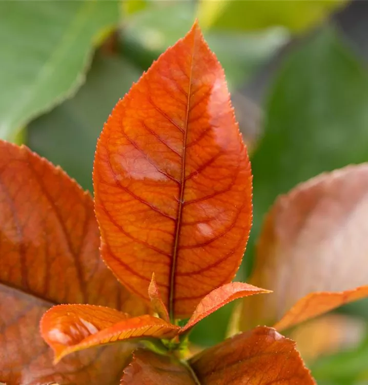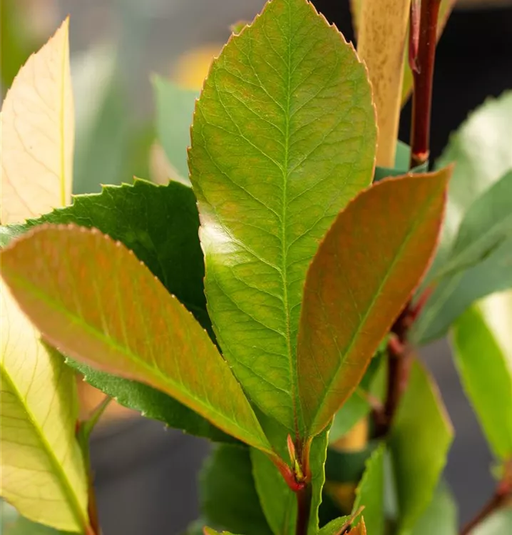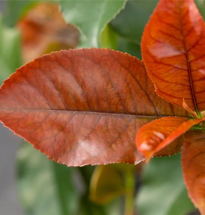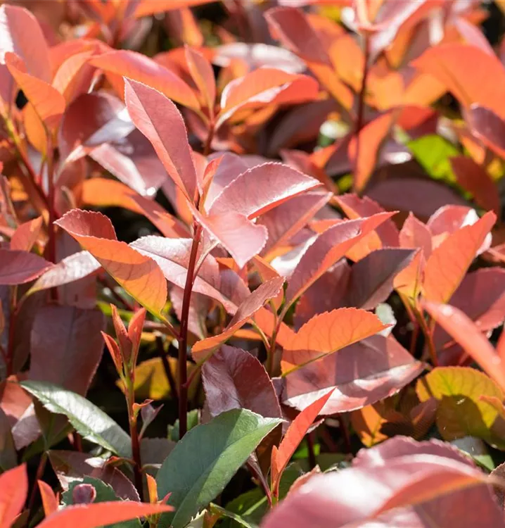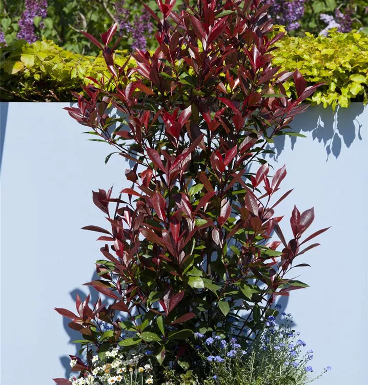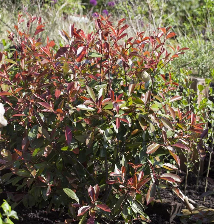 Blüte: Weiß, einfach; Mai-Juni. Laub: Immergrün, Austrieb leuchtend rot. Fruchtschmuck.1,5-3 m hoch + 1,2-2 m br.