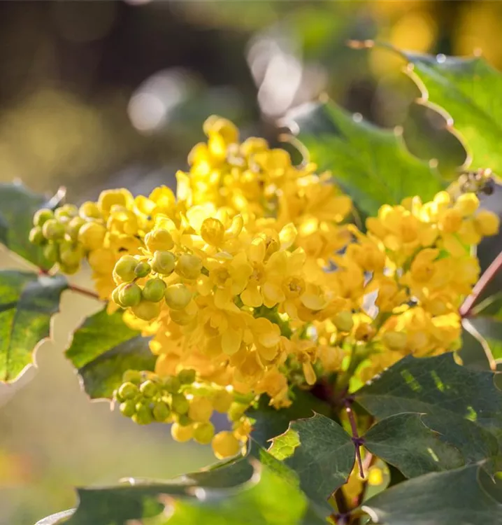 Blüte: Goldgelb, rispenförmig, duftend; April - Mai. Blatt: Dornig,immergrün, rotes Herbstlaub. 60- 100 cm hoch.