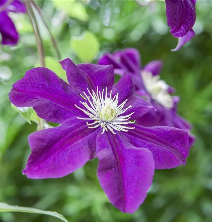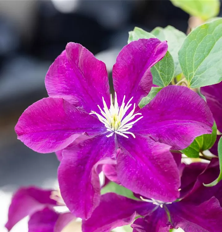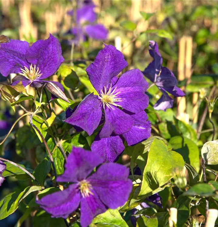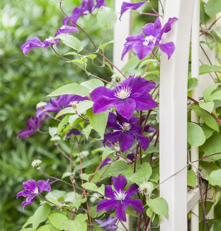 Kletterpflanze, Blüte rotviolett, Juli - September, sonnig - halbschattig, bis 3 m, Kletterhilfe, Einzelstellung, Terrasse,