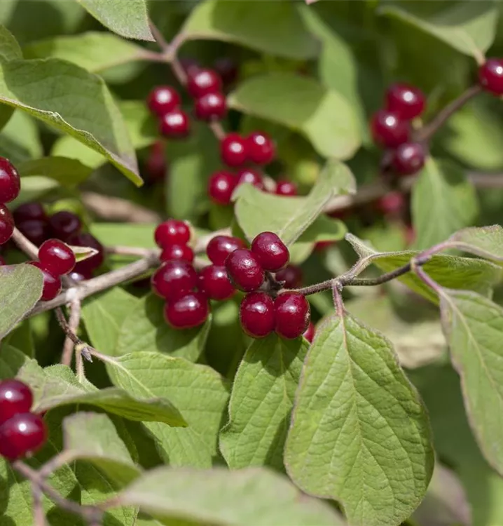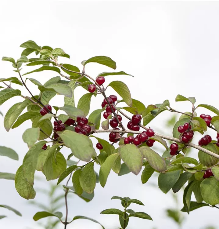 Blüte: Gelblich-weiß, klein; Mai - Juni.Rote Früchte. Laub-