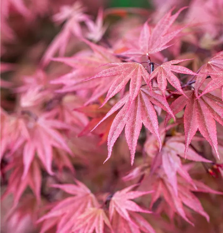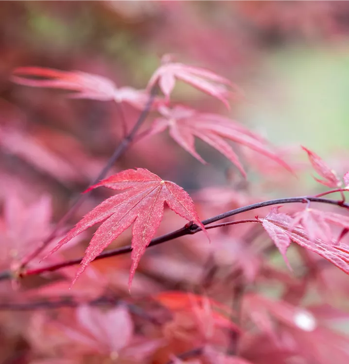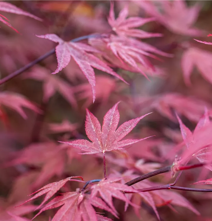 Laub: Purpurrot, klein, 5-lappig. Sehr gut verzweigt.