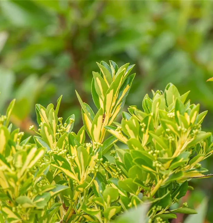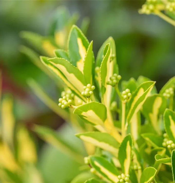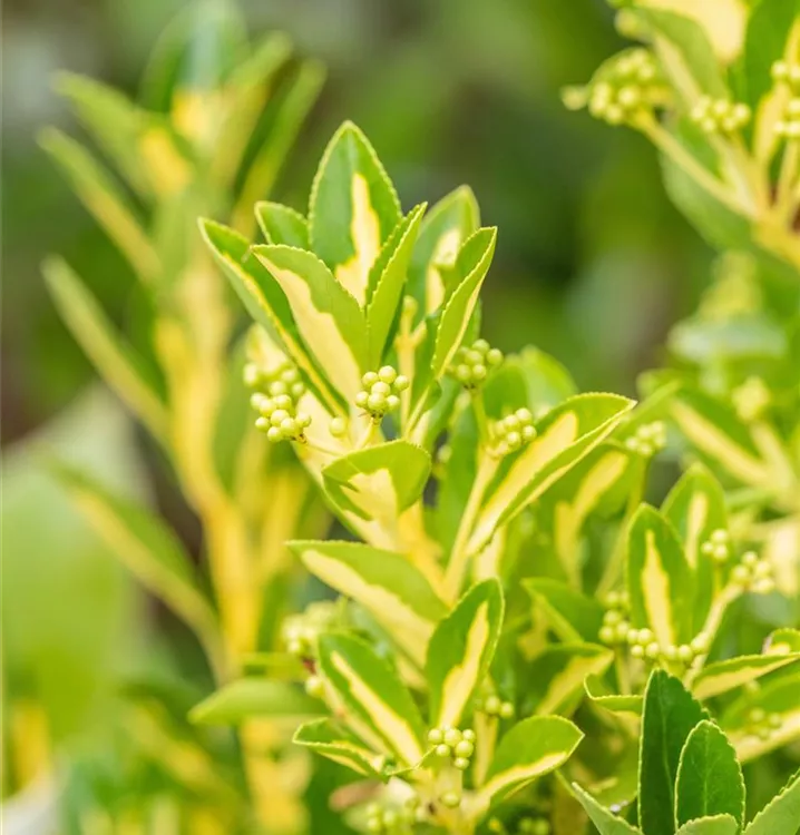 Laub:Gelbbunt,eiförmig; immergrün.Sonne-Halbschatten