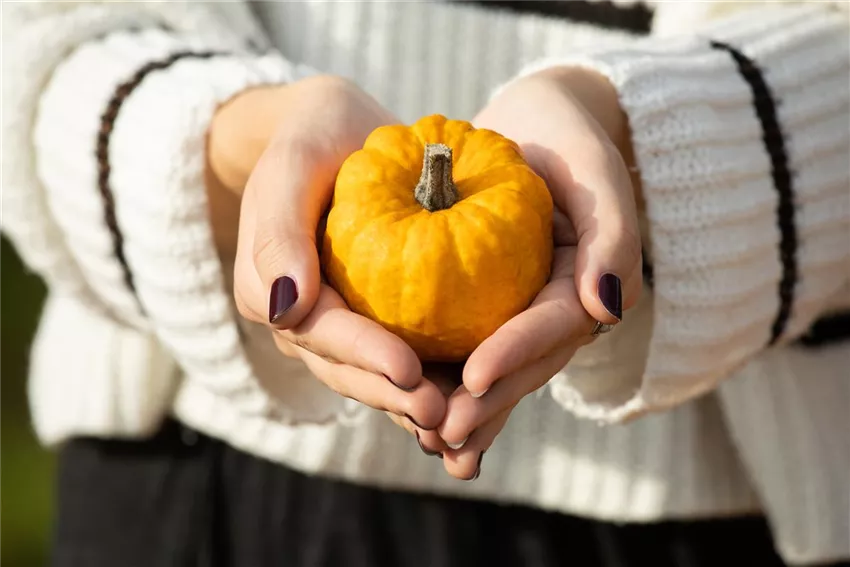 Wenn sich der Sommer Ende August bis Mitte September langsam verabschiedet und die Tage kürzer werden, beginnt die Zeit des Kürbis. Die unterschiedlichen Kürbisarten reifen von September bis Ende Oktober. Man kann einfach prüfen, ob ein Kürbis reif ist. Beim Klopfen auf die Fruchtschale muss der Kürbis hohl klingen. Außerdem muss seine Schale so fest sein, dass sie nicht mehr mit dem Finger eingeritzt werden kann. Ein Kürbis wird inklusive seines holzigen Stielansatzes geerntet. Ohne Stiel oder mit Verletzungen der Fruchthaut kann ein Kürbis nur sehr kurz gelagert werden. Schnell dringen Keime oder Feuchtigkeit ein und der Kürbis verdirbt. Ein optimal geernteter Kürbis ohne Verletzungen kann bei einer Lagertemperatur von bis zu 15 Grad hingegen viele Monate lagern.