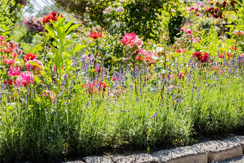 Weil man bei der Gartengestaltung mit Beetrosen nicht nur auf die Blühschönheiten setzen kann, kann man die Pflanzen mit den passenden Nachbarn kombinieren. Je nach Standort kann man dann für die richtigen Akzente sorgen. Da Beetrosen einen buschigen Wuchs haben, muss man sich um die Unterpflanzung eigentlich keine Gedanken machen. Denn auch den Bereich am Boden füllen die Schönheiten verlässlich aus. Aber zwischen den einzelnen Pflanzen kann ein bisschen Platz für andere Schönheiten bleiben. Besonders beliebt in Kombination mit Rosen: Lavendel. Die duftende Staude sorgt nicht nur für ein harmonisches Bild, sie zieht auch Bienen und andere Insekten an, die dem Garten guttun. Oder wie wäre es mit frischen Kräutern? Auch die machen neben den Beetrosen eine gute Figur, wenn sie einen sonnigen Standort mögen. Und dann gibt es da noch den absoluten Klassiker, der bei der Gartengestaltung mit Beetrosen neben den Schönheiten nicht fehlen darf: Buchsbaum. Das Gehölz kann als Beeteinfassung, im Hintergrund oder als Solitär in der Nachbarschaft gepflanzt werden und passt perfekt zu den bunten Blüten der Rosen.