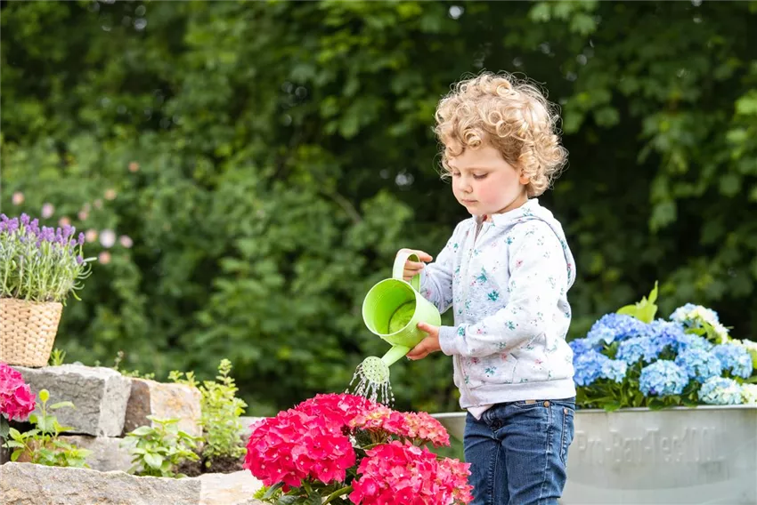 Von Anfang Frühling bis Mitte August kann der Gärtner Hortensien einpflanzen. Das Pflanzloch sollte mindestens doppelt so groß wie der Erdballen sein, damit sich die flachen Wurzeln auch gut entfalten können und nicht abgeknickt oder eingeengt werden. Nun wird die Pflanze eingesetzt und die ausgehobene Erde um den Wurzelballen herum eingefüllt. Zum Schluss wird die Erde noch einmal vorsichtig festgetreten und die junge Hortensie kräftig angegossen. Hortensien pflegen heißt vor allem auch, sie gut zu gießen, das fängt schon direkt nach dem Einpflanzen an. Denn eine gute Bewässerung nach dem Pflanzen begünstigt die Verwurzelung der Hortensie. Nun steht einer üppigen Blütenpracht nichts mehr im Wege.